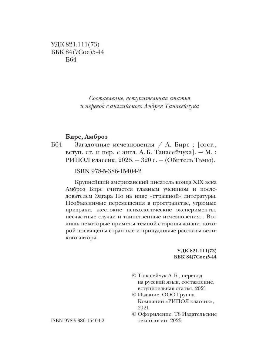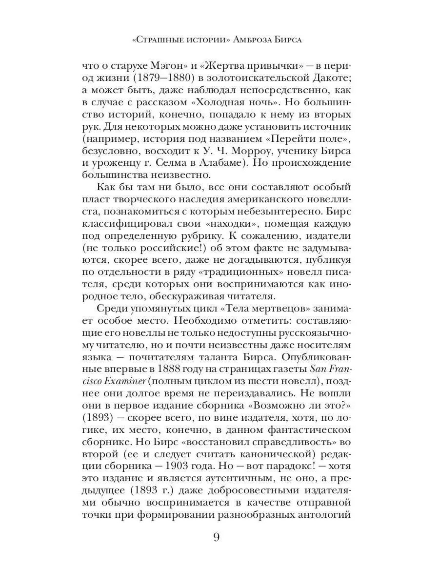 Крупнейший американский писатель конца XIX века, Амброз Бирс считается главным учеником и последователем Эдгара По на ниве "литературы ужасов". Необъяснимые перемещения в пространстве, угрюмые призраки, жестокие психологические эксперименты, несчастные случаи и таинственные исчезновения… Вот лишь некоторые приметы темной стороны жизни, которой посвящены странные и причудливые рассказы великого литератора.
