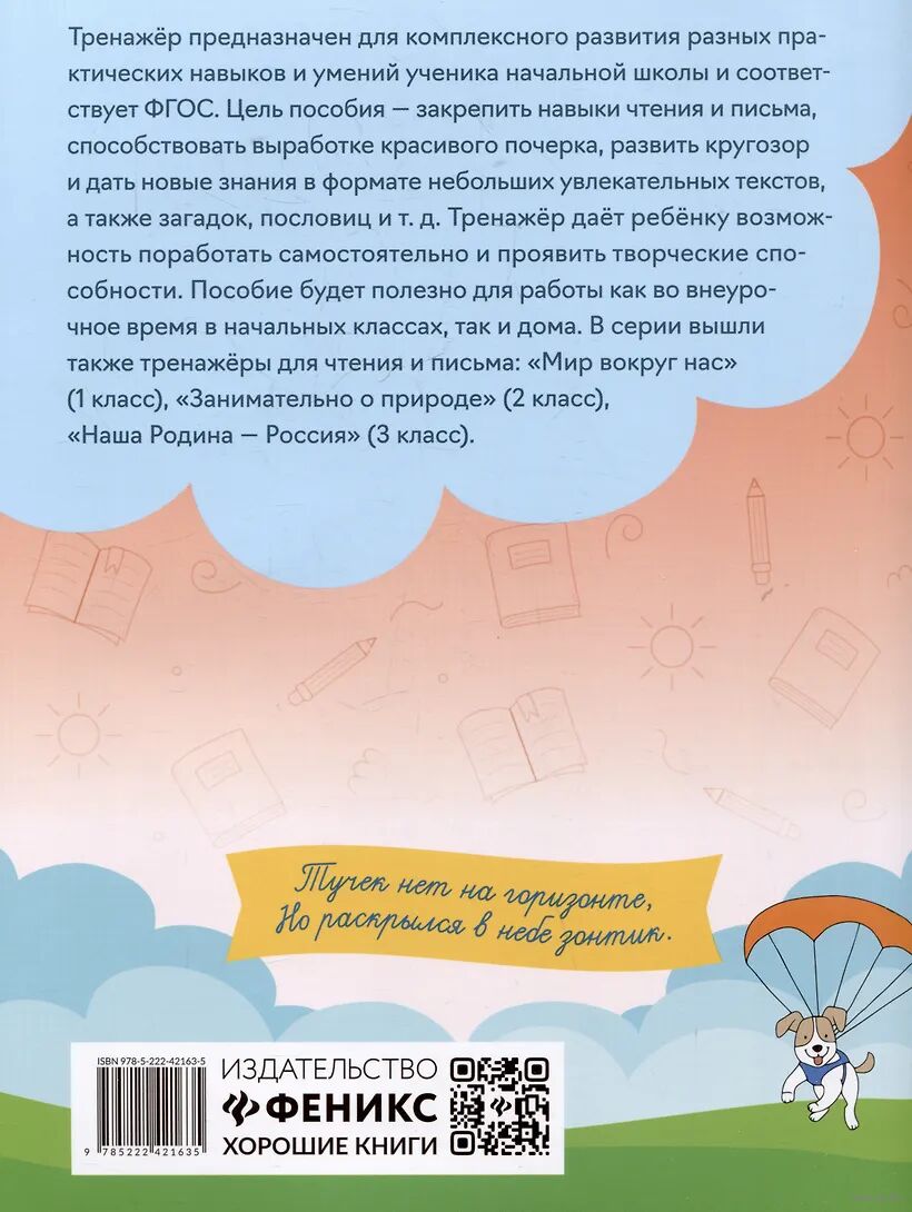 Тренажёр предназначен для комплексного развития разных практических навыков и умений ученика начальной школы и соответствует ФГОС. Цель пособия – закрепить навыки чтения и письма, способствовать выработке красивого почерка, развить кругозор и дать новые знания в формате небольших увлекательных текстов. Наполнение тренажёра разнообразное: короткие рассказы, загадки, пословицы, рисунки для раскрашивания. Тренажёр даёт ребёнку возможность поработать самостоятельно и проявить творческие способности. Отвечая на вопросы, составляя тексты, ученик развивает тем самым мыслительные и логические навыки. Автор тренажёра надеется, что пособие будет полезно для работы как во внеурочное время в начальных классах, так й дома. В серии вышли также тренажёры для чтения и письма: "Мир вокруг нас" (1 класс), "Занимательно о природе" (2 класс), "Наша Родина – Россия" (3 класс).