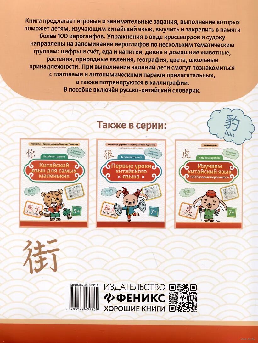 Сборник предлагает игровые и занимательные задания, выполнение которых поможет детям, изучающим китайский язык, выучить и закрепить знание более 100 иероглифов. Упражнения в виде кроссвордов и судоку направлены на запоминание иероглифов по нескольким тематическим группам: цифры и счёт, еда и напитки, дикие и домашние животные, растения, природные явления, география, цвета, школьные принадлежности. При выполнении заданий дети смогут познакомиться с глаголами и антонимическими парами прилагательных, а также потренируются в каллиграфии. В пособие включён русско-китайский словарик.Пособие адресовано ученикам начальной школы, изучающим китайский язык, а также учителям китайского языка, методистам и преподавателям языковых школ и курсов.