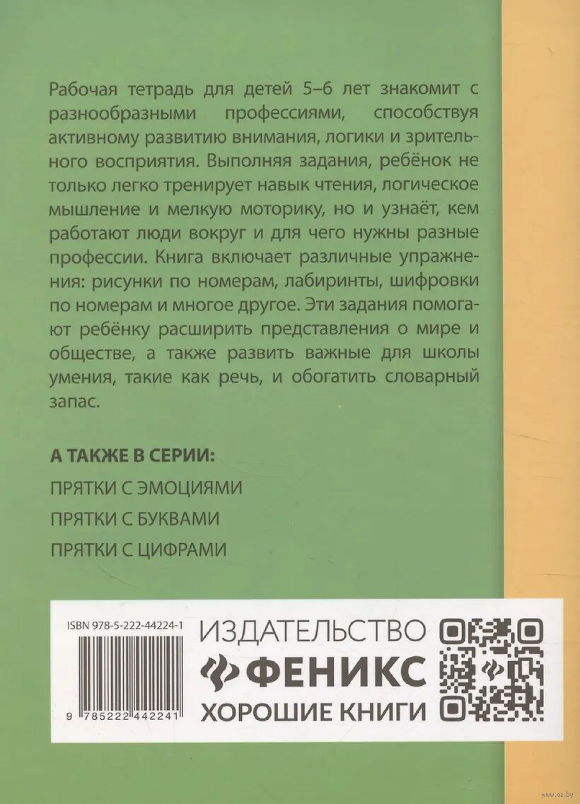 Рабочая тетрадь для детей 5-6 лет знакомит с разнообразными профессиями, способствуя активному развитию внимания, логики и зрительного восприятия. Выполняя задания, ребёнок не только легко тренирует навык чтения, логическое мышление и мелкую моторику, но и узнаёт, кем работают люди вокруг и для чего нужны разные профессии. Книга включает различные упражнения: рисунки по номерам, лабиринты, шифровки по номерам и многое другое. Эти задания помогают ребёнку расширить представления о мире и обществе, а также развить важные для школы умения, такие как речь, и обогатить словарный запас.