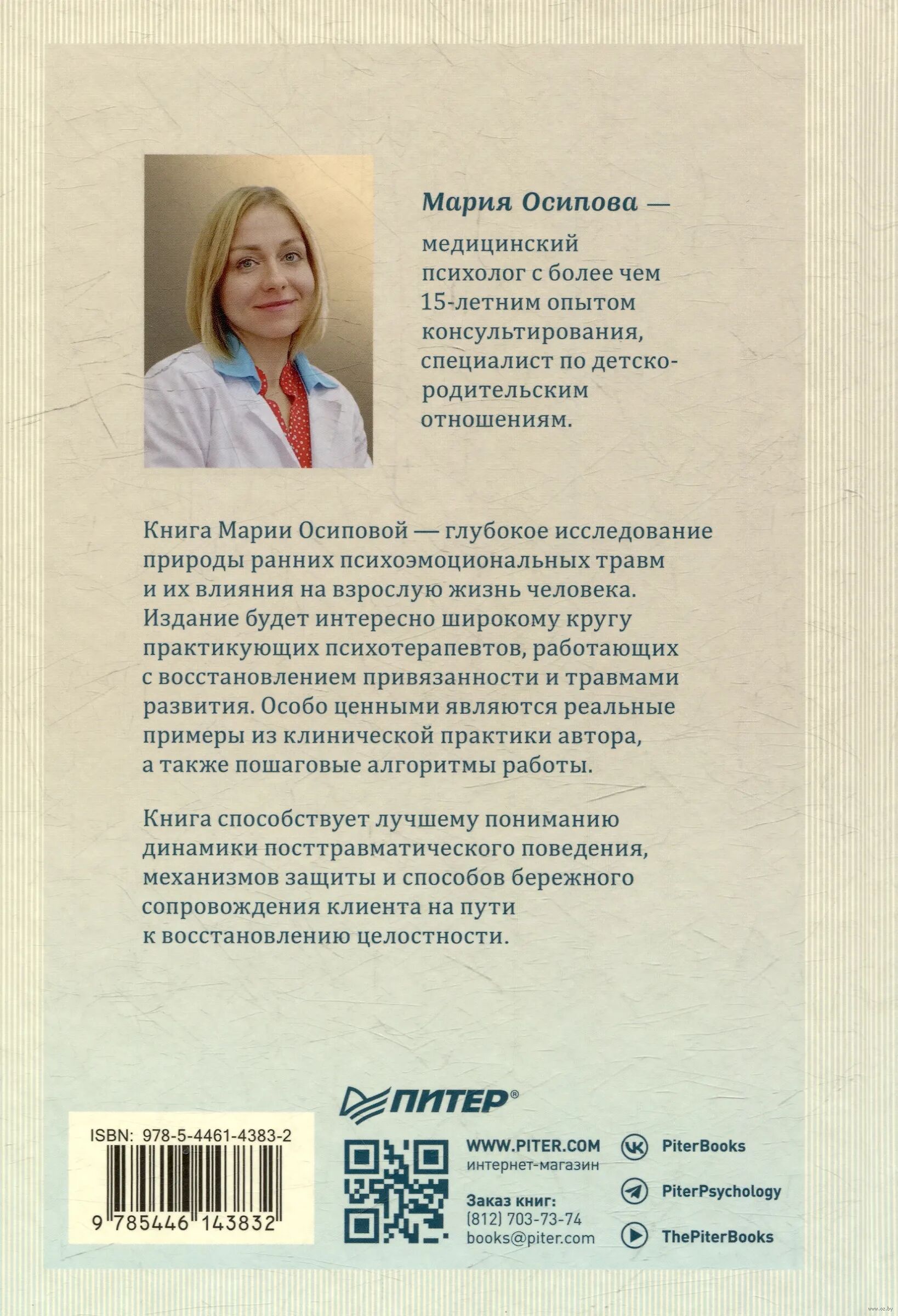 Книга Марии Осиповой – медицинского психолога, специалиста по детско-родительским отношениям – это глубокое исследование природы ранних психоэмоциональных травм и их влияния на взрослую жизнь человека. Издание будет интересно широкому кругу практикующих психотерапевтов, работающих с восстановлением привязанности и травмами развития. Особо ценными являются реальные примеры из клинической практики автора, а также пошаговые алгоритмы работы. Книга способствует лучшему пониманию динамики посттравматического поведения, механизмов защиты и способов бережного сопровождения клиента на пути к восстановлению целостности.