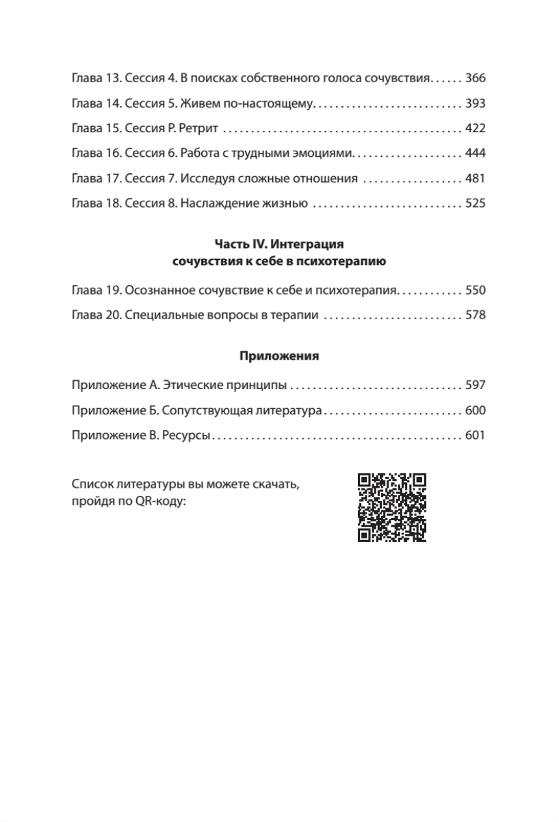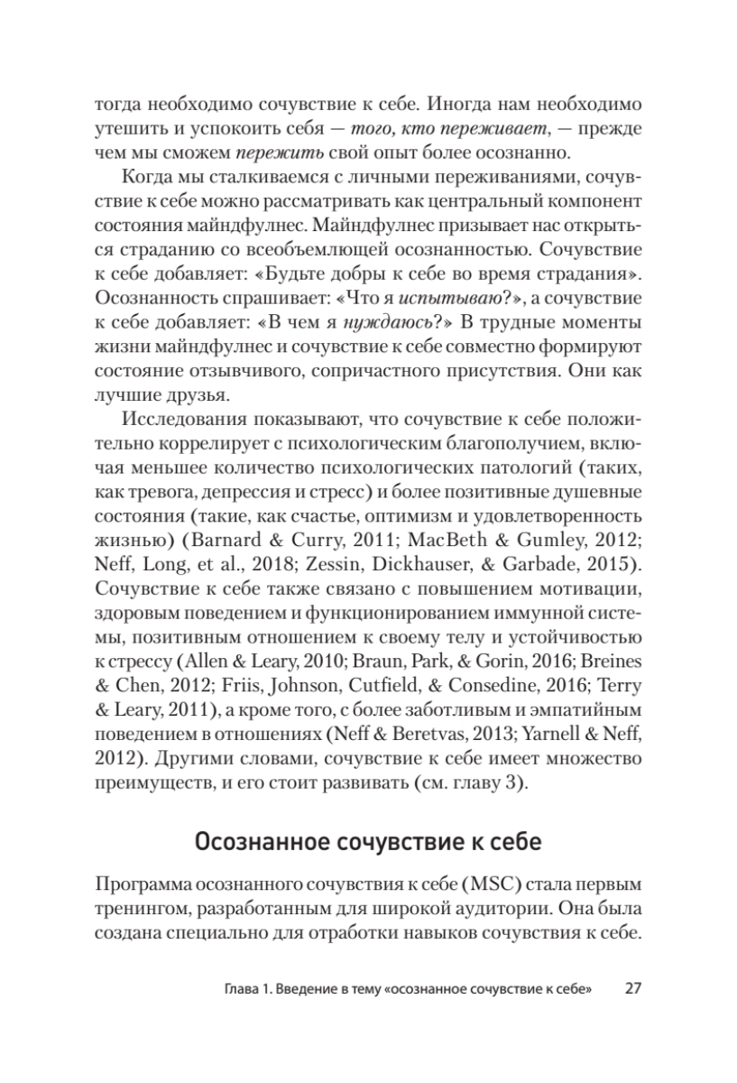 Мировые эксперты по осознанному самосостраданию, Кристин Нефф и Кристофер Гремер, предлагают руководство по освоению этого метода психотерапии. В этой книге вы найдете описание теории и подтверждающих ее исследований, а также уникальную программу, по которой можно обучать этому методу. Интересные примеры, взятые из сессий, помогают переформулировать привычные самоуничижительные мысли в поддерживающие, критическое самоотношение в ресурсное. Книга будет полезна как практикующим психотерапевтам, так и всем, кто хочет научиться поддерживать себя в трудные моменты с добротой и пониманием.
