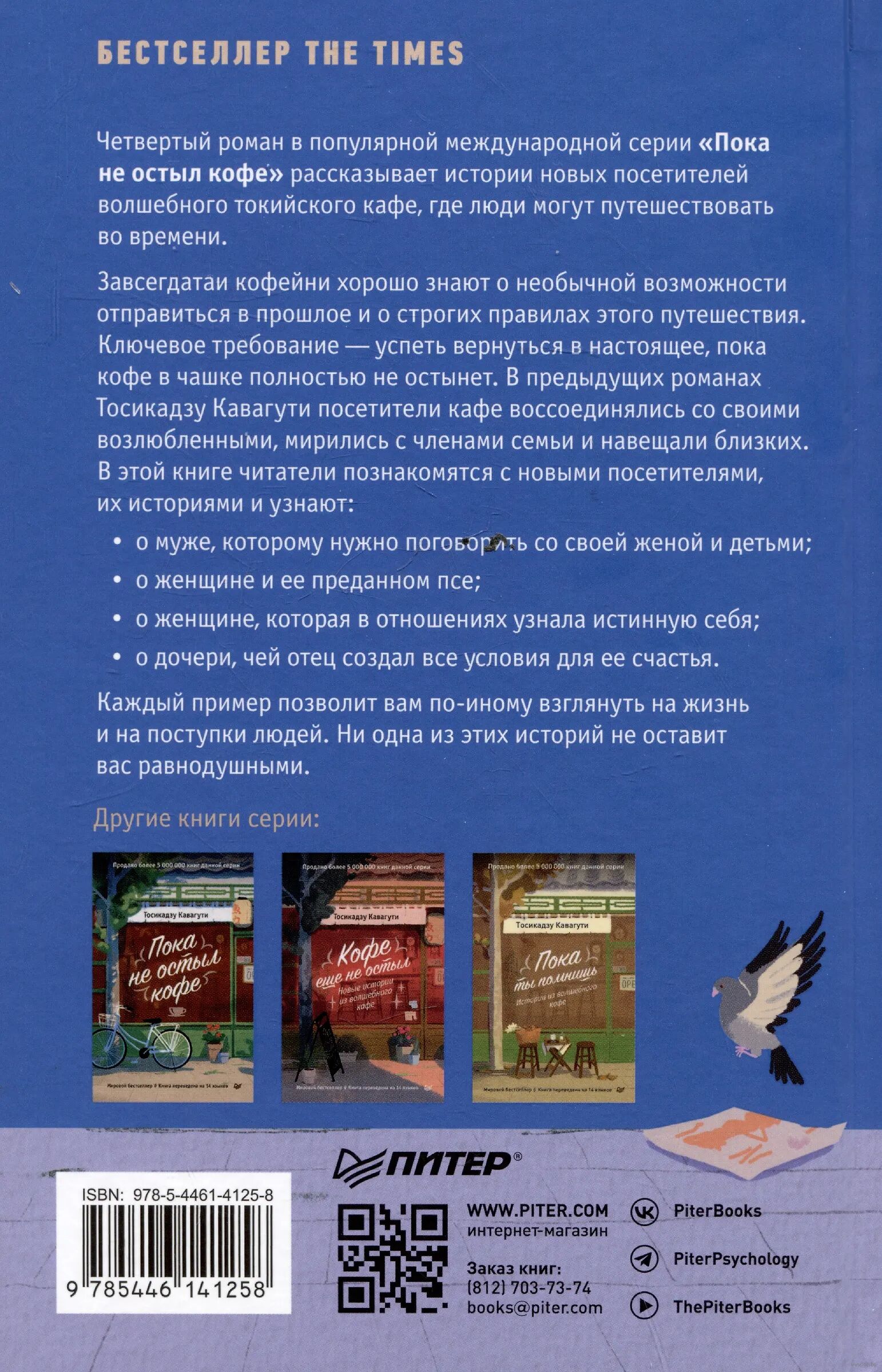 Четвёртый роман в популярной международной серии "Пока не остыл кофе" рассказывает истории новых посетителей волшебного токийского кафе, где люди могут путешествовать во времени. Завсегдатаи кофейни хорошо знают о необычной возможности отправиться в прошлое и о строгих правилах этого путешествия. Ключевое требование – успеть вернуться в настоящее, пока кофе в чашке полностью не остынет. В предыдущих романах Тосикадзу Кавагути посетители кафе воссоединялись со своими возлюбленными, мирились с членами семьи и навещали близких.
