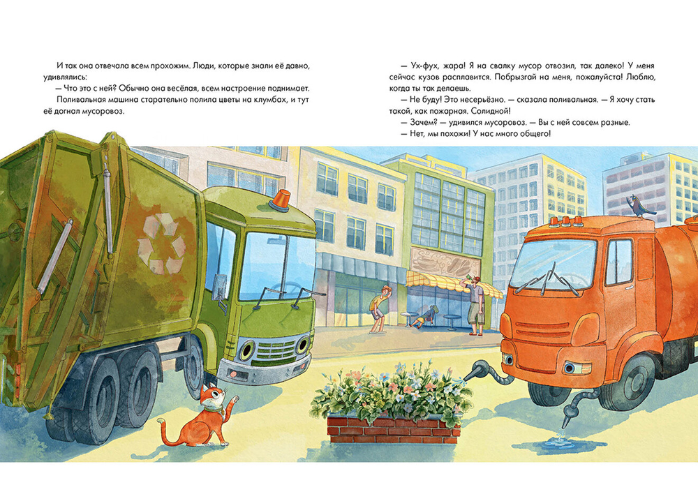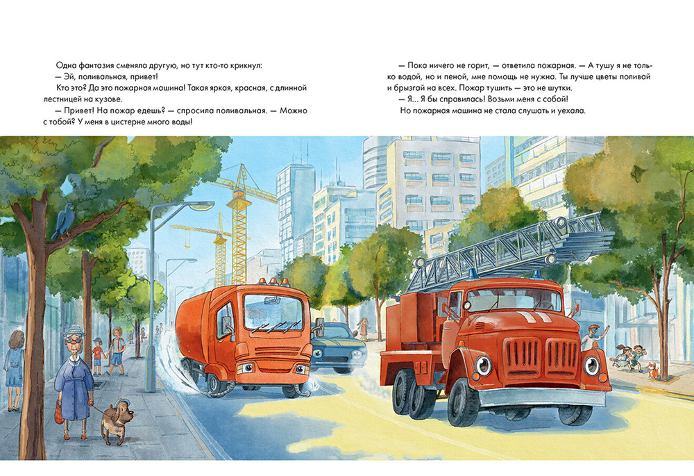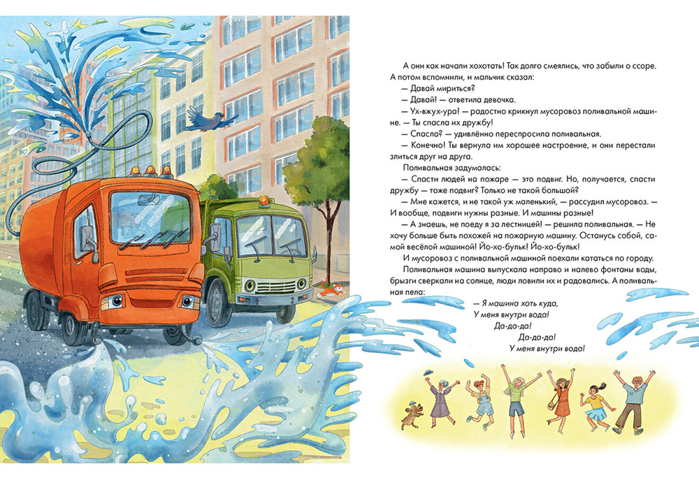 Все дети обожали весёлую поливальную машину. Она знала, что её работа важна, но всегда мечтала о подвиге. Однажды, выехав на маршрут, она услышала, что её считают несерьёзной… Почему? Ведь она может не только веселиться! Машина призадумалась и решила измениться. И больше никаких шуток!