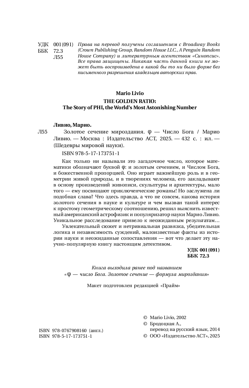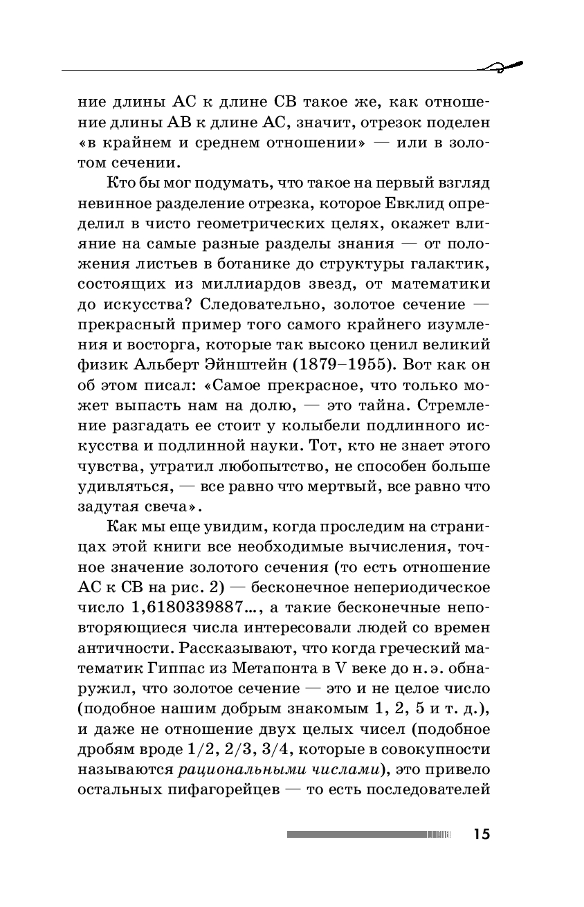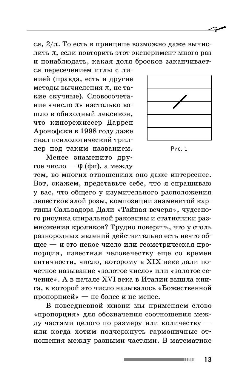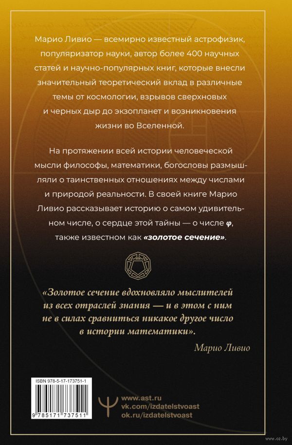 Как только ни называли это загадочное число, которое математики обозначают буквой φ: и золотым сечением, и Числом Бога, и божественной пропорцией. Оно играет важнейшую роль и в геометрии живой природы, и в творениях человека, его закладывают в основу произведений живописи, скульптуры и архитектуры, мало того – ему посвящают приключенческие романы! Но заслужена ли подобная слава? Что здесь правда, а что не совсем, какова история золотого сечения в науке и культуре и чем вызван такой интерес к простому геометрическому соотношению, решил выяснить Марио Ливио. Уникальное расследование привело к неожиданным результатам…