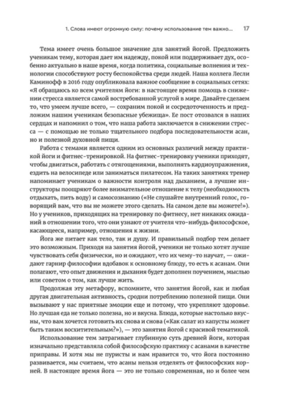 Это руководство будет полезно учителям, инструкторам и тем, кто занимается йогой самостоятельно и хочет поднять свои тренировки на новый уровень. Оно начинается с части, посвященной голосу, аутентичности, манере подачи материала, практике, повторению и источникам вдохновения. За ней следует вторая часть, где предлагается более 50 готовых тем, которые вы можете положить в основу своих занятий. В последней части приводятся шаблоны для создания ваших тем и записи идей.