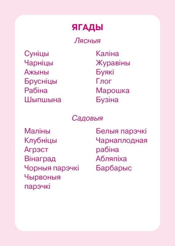 Дидактические карточки "Ягоды" из нашей новой серии ЛЕГКО! направлены на формирование, расширение и закрепление представлений о ягодах, обогащение словарного запаса детей, воспитание познавательного интереса к миру растений. Будут способствовать развитию речевых умений и навыков, внимания, восприятия, памяти, логического мышления, умений ориентироваться на листе бумаги, отвечать на вопросы, подготовке к обучению грамоте, формированию навыков понимания белорусского языка.