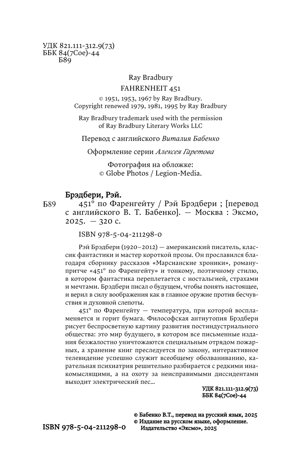 Рэй Брэдбери (1920–2012) – американский писатель, классик фантастики и мастер короткой прозы. Он прославился благодаря сборнику рассказов "Марсианские хроники", роману-притче "451° по Фаренгейту" и тонкому, поэтичному стилю, в котором фантастика переплетается с ностальгией, страхами и мечтами. Брэдбери писал о будущем, чтобы понять настоящее, и верил в силу воображения как в главное оружие против бесчувствия и духовной слепоты.
