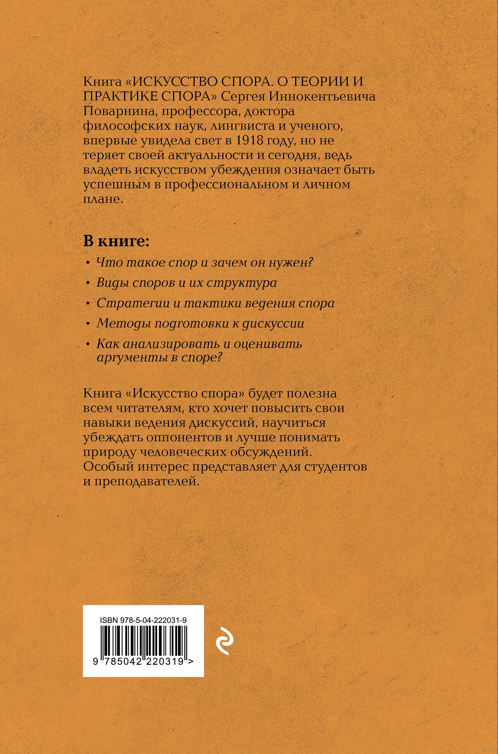 Книга С. Поварнина "Искусство спора. О теории и практике спора" предоставляет читателям уникальную возможность освоить навыки аргументированной беседы и убедительного диалога. Автор детально рассматривает природу споров, предлагая стратегии и приемы, которые помогут успешно участвовать в дискуссиях и избегать распространенных ошибок. Книга полна историческими примерами и практическими заданиями, что позволяет эффективно закрепить теоретические знания. Для любителей интеллектуальных бесед эта книга станет надежным помощником и наставником, обучая не только отстаивать свое мнение, но и уважать точку зрения собеседника.