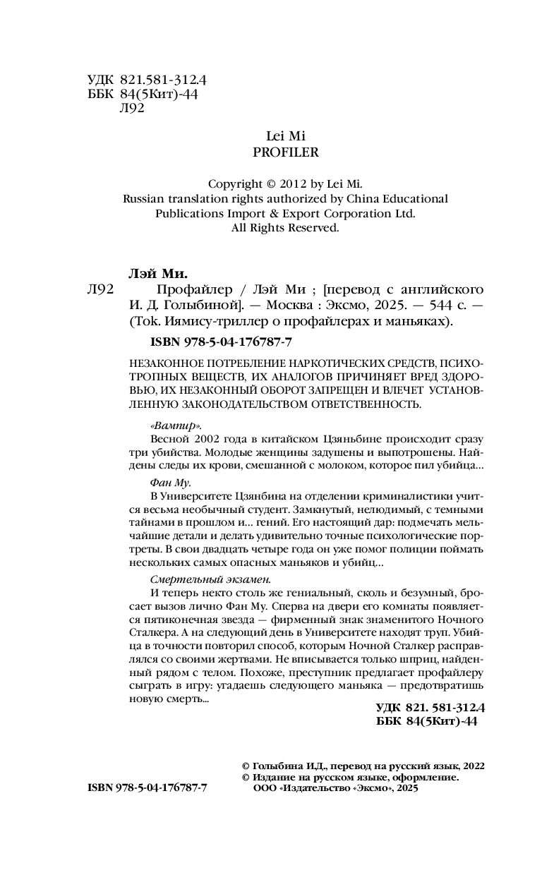 Смертельный экзамен. И теперь некто столь же гениальный, сколь и безумный, бросает вызов лично Фан Му. Сперва на двери его комнаты появляется пятиконечная звезда – фирменный знак знаменитого Ночного Сталкера. А на следующий день в Университете находят труп. Убийца в точности повторил способ, которым Ночной Сталкер расправлялся со своими жертвами. Не вписывается только шприц, найденный рядом с телом. Похоже, преступник предлагает профайлеру сыграть в игру: угадаешь следующего маньяка – предотвратишь новую смерть...