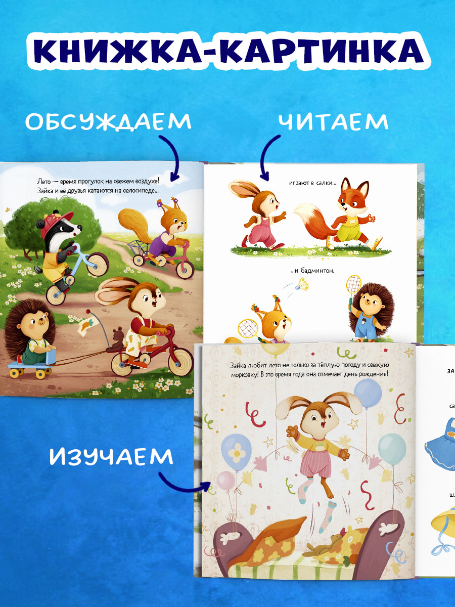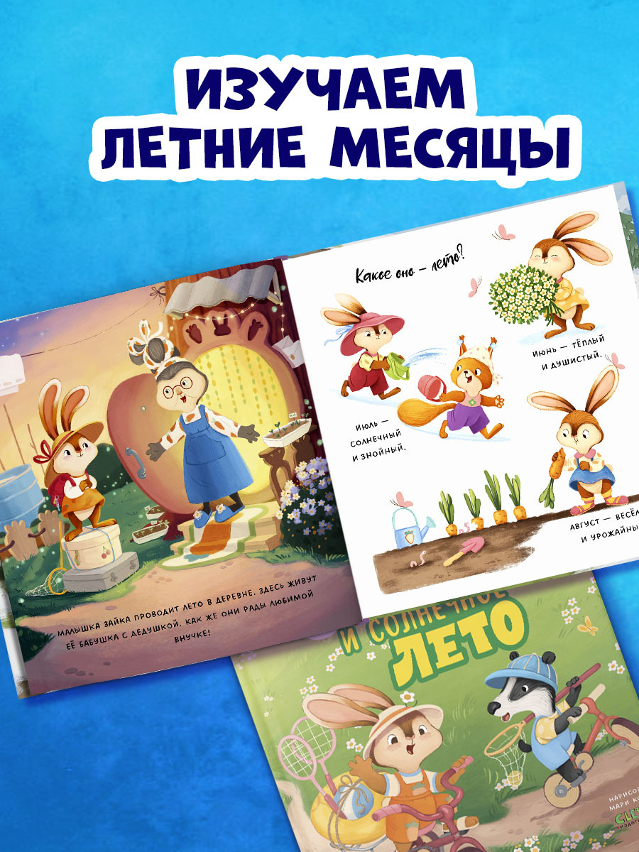 Наслаждайтесь теплом вместе с зайкой! Это самая солнечная и летняя книжка-картинка для первого чтения, для малышей от 2 лет. Здесь есть и приключения животных, и развивающие задания.