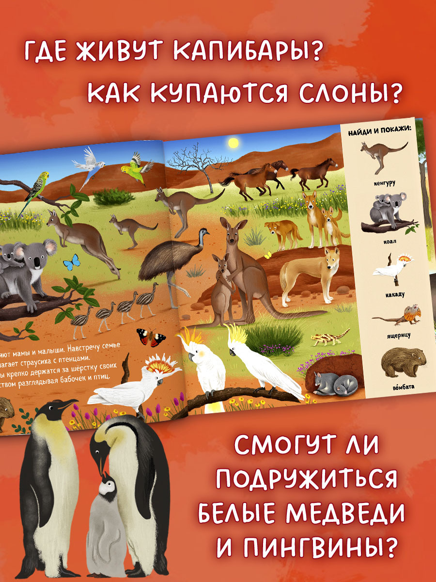 Увлекательная книга-игра для маленьких исследователей! Отправляйтесь в путешествие по ярким разворотам и рассматривайте необычных животных из разных уголков планеты. Побывайте на разных континентах и найдите жирафа в саванне, ягуара в джунглях, оленя в лесу. Листая страницы с картинками и выполняя интересные развивающие задания, узнайте, где живут капибары и где купаются слоны.