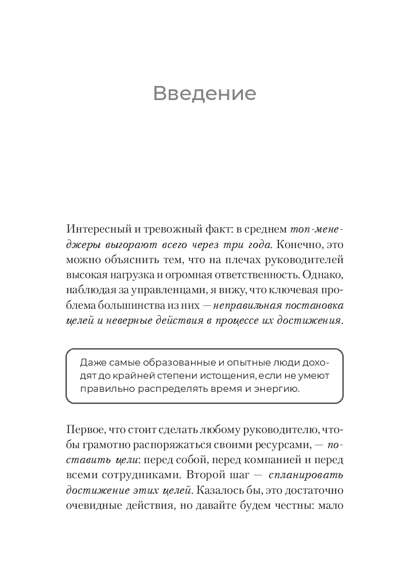 Алгоритмы и советы из книги помогут вам четко формулировать цели для себя, компании и команды, вовлекать сотрудников в достижение масштабных целей, правильно делегировать задачи и эффективно планировать время, сохранять энергию на долгом пути к успеху.