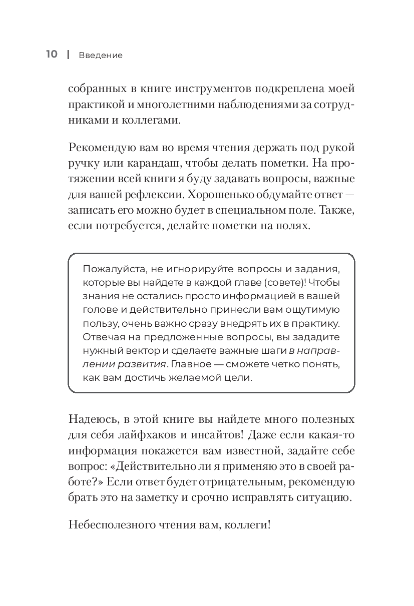 Каждый инструмент и подход, предложенный автором, был протестирован на практике. В книге вы найдете вопросы для рефлексии, чтобы глубже понять свои цели и переосмыслить управленческую практику, а также советы для максимальной продуктивности. Полезные лайфхаки и инсайты можно сразу применить в работе.
