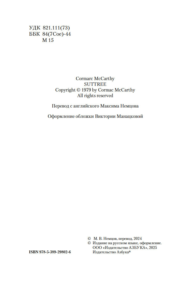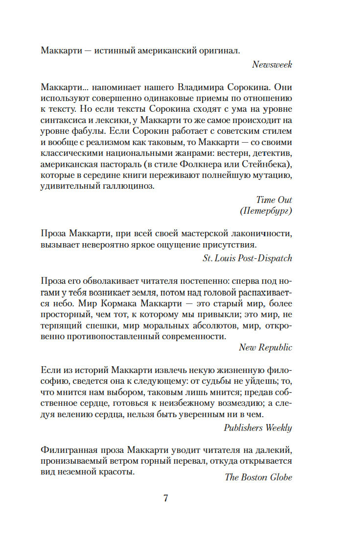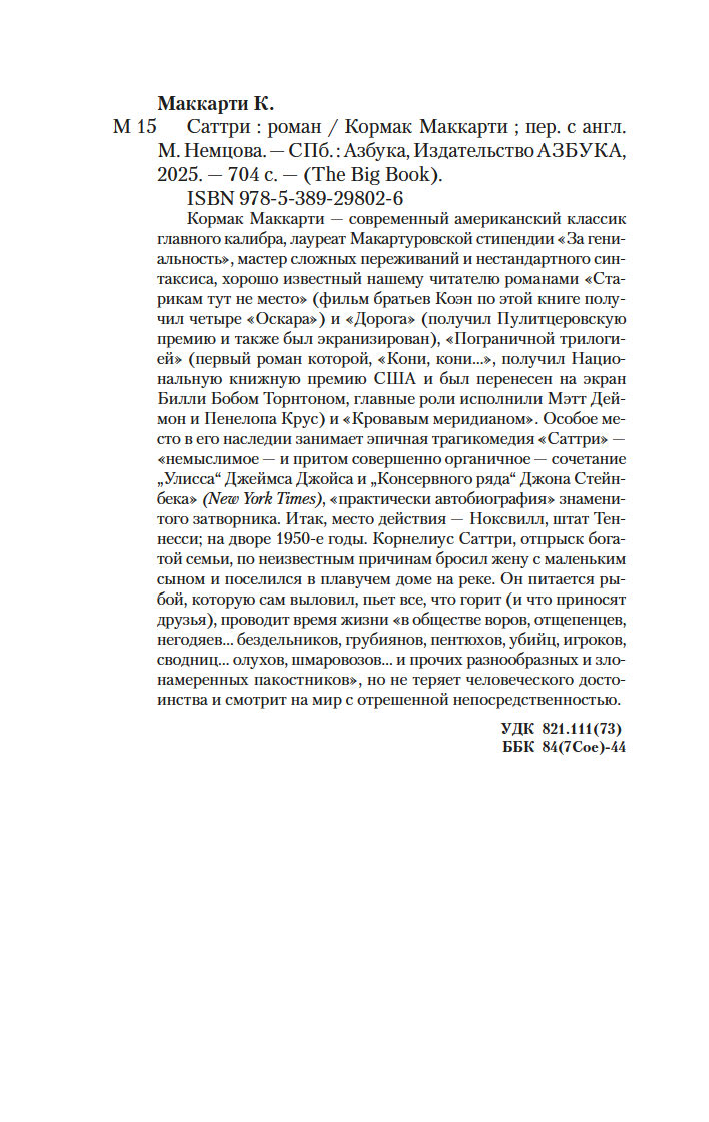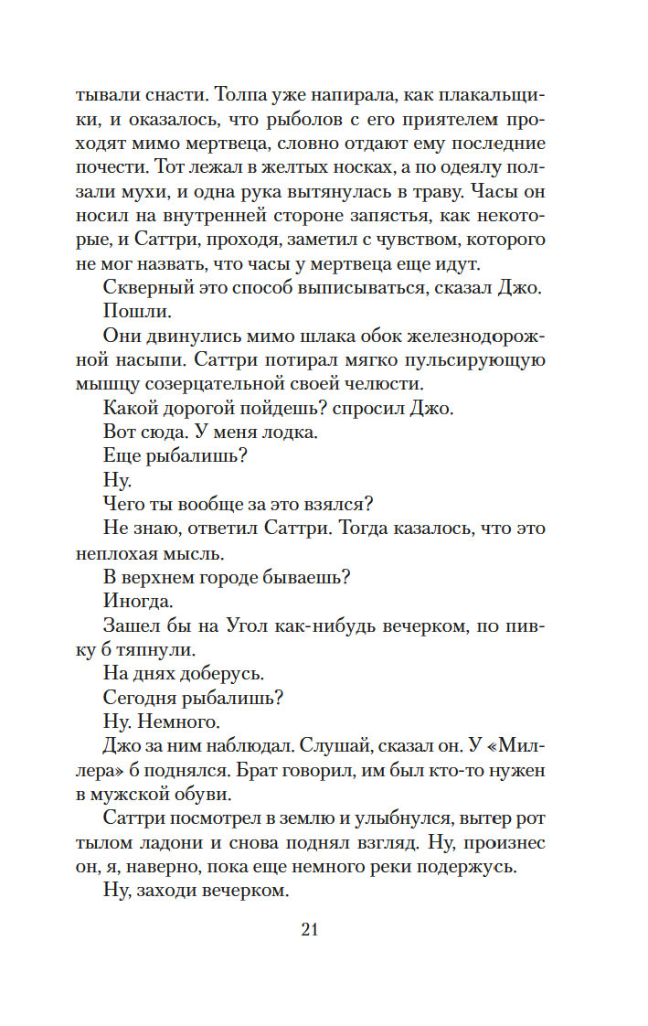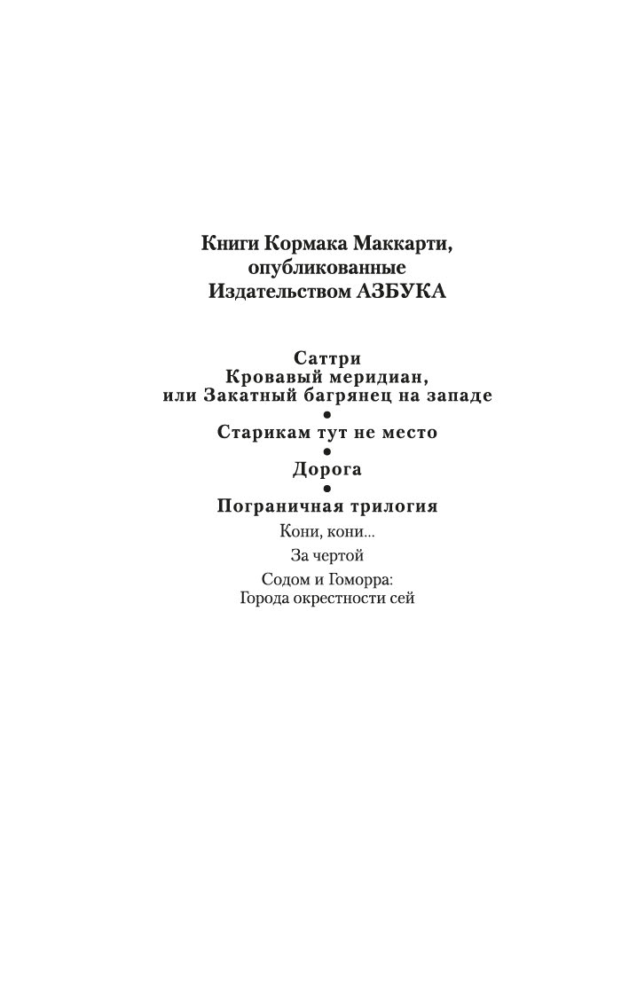 Кормак Маккарти – современный американский классик главного калибра, лауреат Макартуровской стипендии "За гениальность", мастер сложных переживаний и нестандартного синтаксиса, хорошо известный нашему читателю романами "Старикам тут не место" (фильм братьев Коэн по этой книге получил четыре "Оскара") и "Дорога" (получил Пулицеровскую премию и также был экранизирован), "Пограничной трилогией" (первый роман которой, "Кони, кони...", получил Национальную книжную премию США и был перенесен на экран Билли Бобом Торнтоном, главные роли исполнили Мэтт Деймон и Пенелопа Крус) и "Кровавым меридианом". Особое место в его наследии занимает эпичная трагикомедия "Саттри" – "немыслимое – и притом совершенно органичное – сочетание „Улисса" Джеймса Джойса и „Консервного ряда" Джона Стейнбека" (New York Times), "практически автобиография" знаменитого затворника. Итак, место действия – Ноксвилл, штат Теннесси; на дворе 1950-е годы. Корнелиус Саттри, отпрыск богатой семьи, по неизвестным причинам бросил жену с маленьким сыном и поселился в плавучем доме на реке. Он питается рыбой, которую сам выловил, пьет все, что горит (и что приносят друзья), проводит время жизни "в обществе воров, отщепенцев, негодяев... бездельников, грубиянов, пентюхов, убийц, игроков, сводниц... олухов, шмаровозов... и прочих разнообразных и злонамеренных пакостников", но не теряет человеческого достоинства и смотрит на мир с отрешенной непосредственностью.