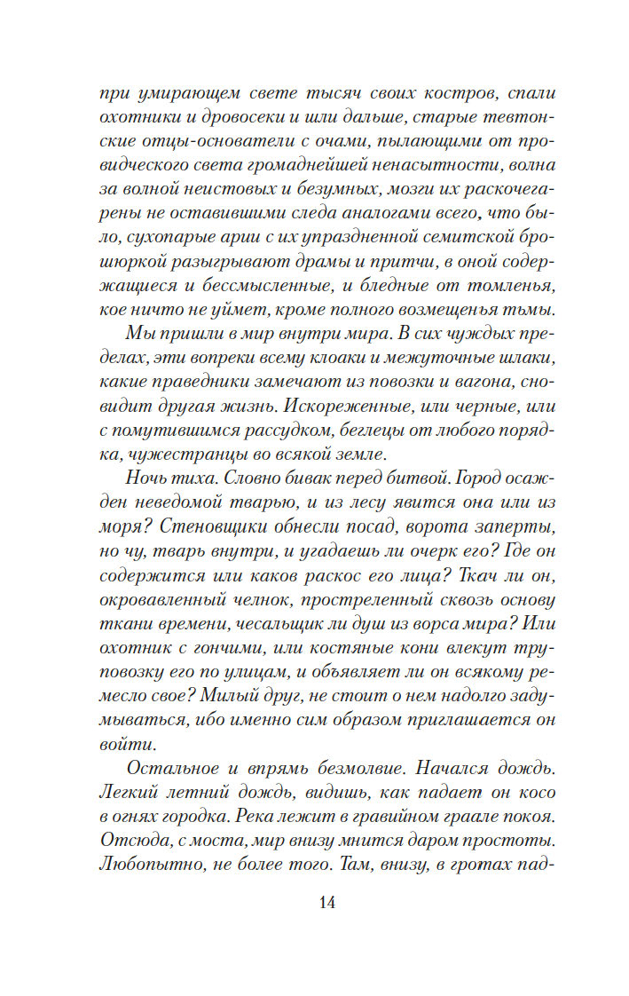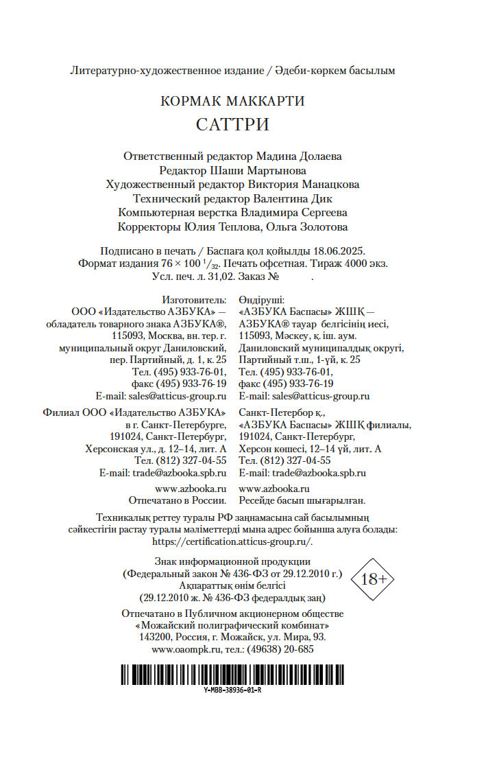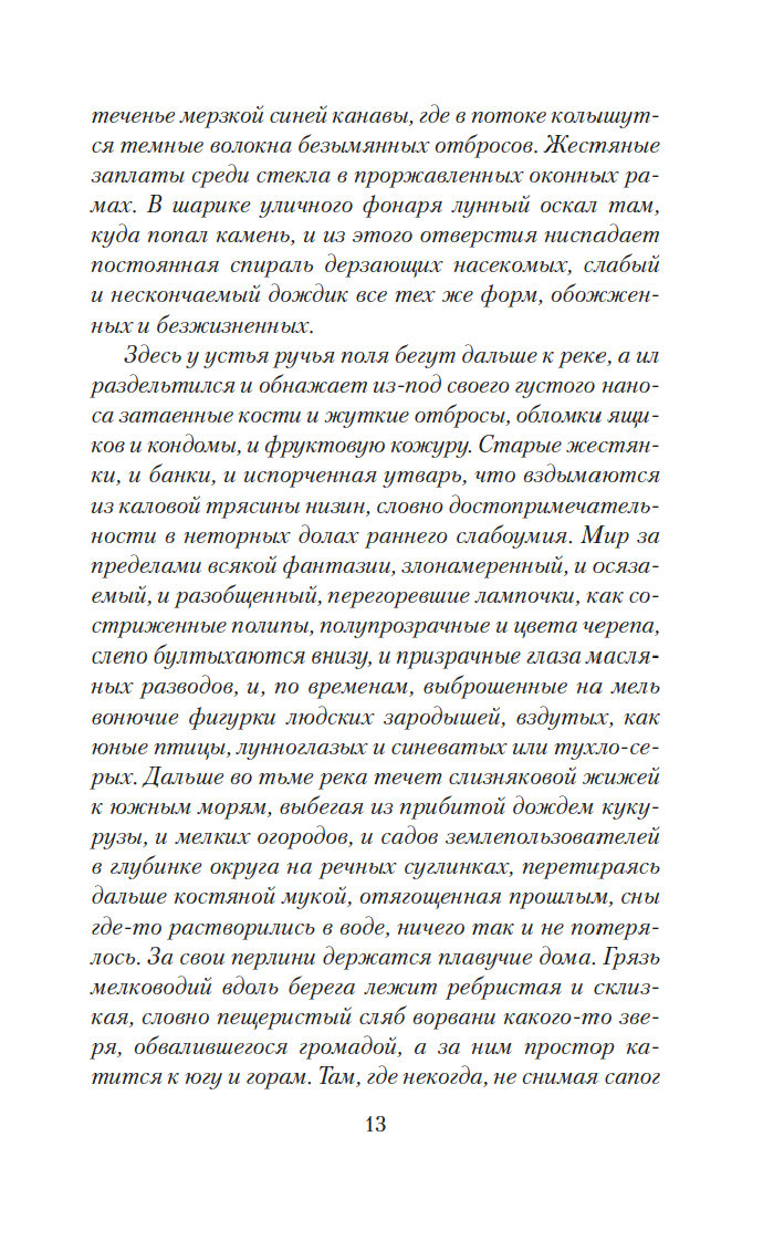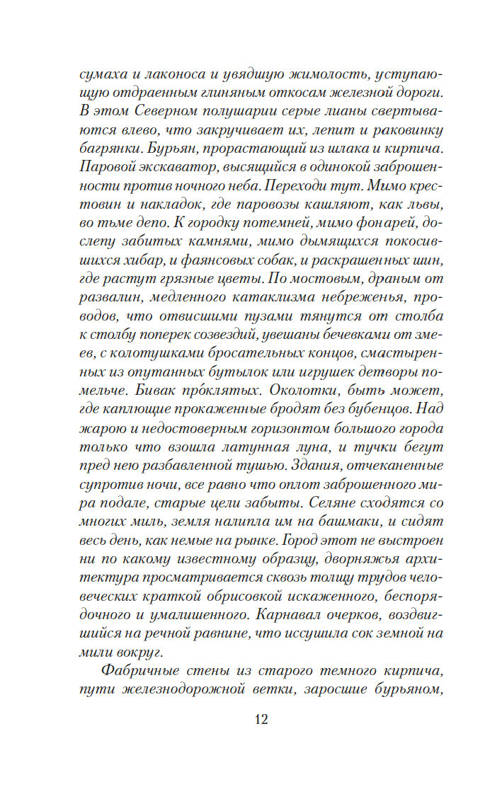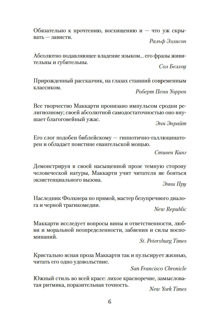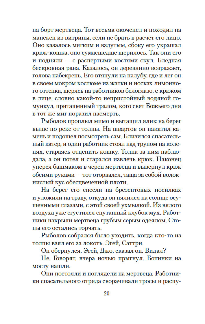 Кормак Маккарти – современный американский классик главного калибра, лауреат Макартуровской стипендии "За гениальность", мастер сложных переживаний и нестандартного синтаксиса, хорошо известный нашему читателю романами "Старикам тут не место" (фильм братьев Коэн по этой книге получил четыре "Оскара") и "Дорога" (получил Пулицеровскую премию и также был экранизирован), "Пограничной трилогией" (первый роман которой, "Кони, кони...", получил Национальную книжную премию США и был перенесен на экран Билли Бобом Торнтоном, главные роли исполнили Мэтт Деймон и Пенелопа Крус) и "Кровавым меридианом". Особое место в его наследии занимает эпичная трагикомедия "Саттри" – "немыслимое – и притом совершенно органичное – сочетание „Улисса" Джеймса Джойса и „Консервного ряда" Джона Стейнбека" (New York Times), "практически автобиография" знаменитого затворника. Итак, место действия – Ноксвилл, штат Теннесси; на дворе 1950-е годы. Корнелиус Саттри, отпрыск богатой семьи, по неизвестным причинам бросил жену с маленьким сыном и поселился в плавучем доме на реке. Он питается рыбой, которую сам выловил, пьет все, что горит (и что приносят друзья), проводит время жизни "в обществе воров, отщепенцев, негодяев... бездельников, грубиянов, пентюхов, убийц, игроков, сводниц... олухов, шмаровозов... и прочих разнообразных и злонамеренных пакостников", но не теряет человеческого достоинства и смотрит на мир с отрешенной непосредственностью.