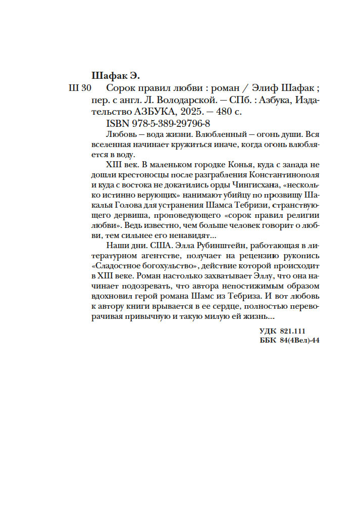 XIII век. В маленьком городке Конья, в городке, куда с запада не дошли крестоносцы после разграбления Константинополя и куда с востока не докатились орды Чингисхана, "несколько истинно верующих" нанимают убийцу по прозвищу Шакалья Голова для устранения Шамса Тебризи, странствующего дервиша, проповедующего "сорок правил религии любви". Ведь известно, чем больше человек говорит о любви, тем сильнее его ненавидят...