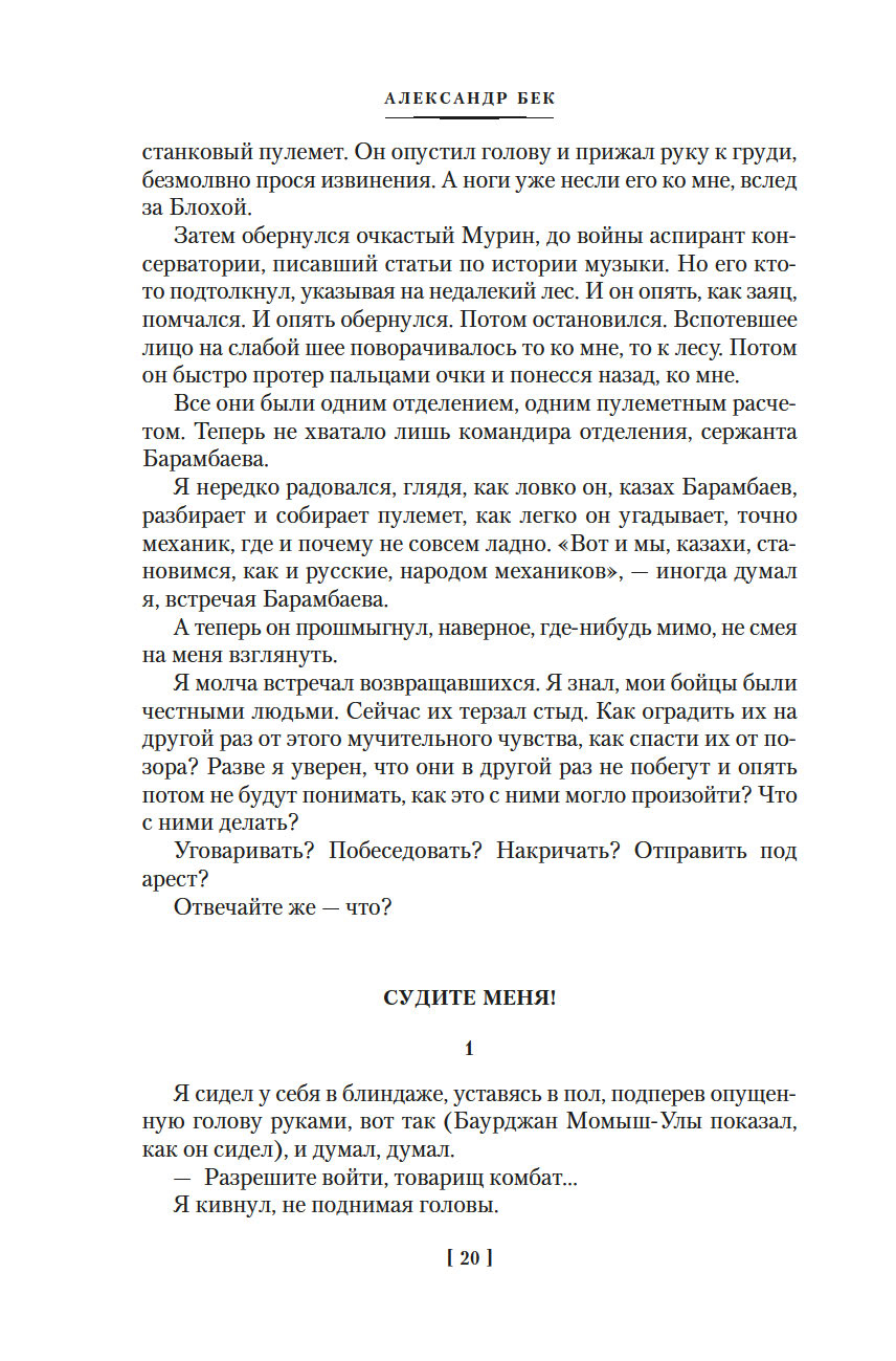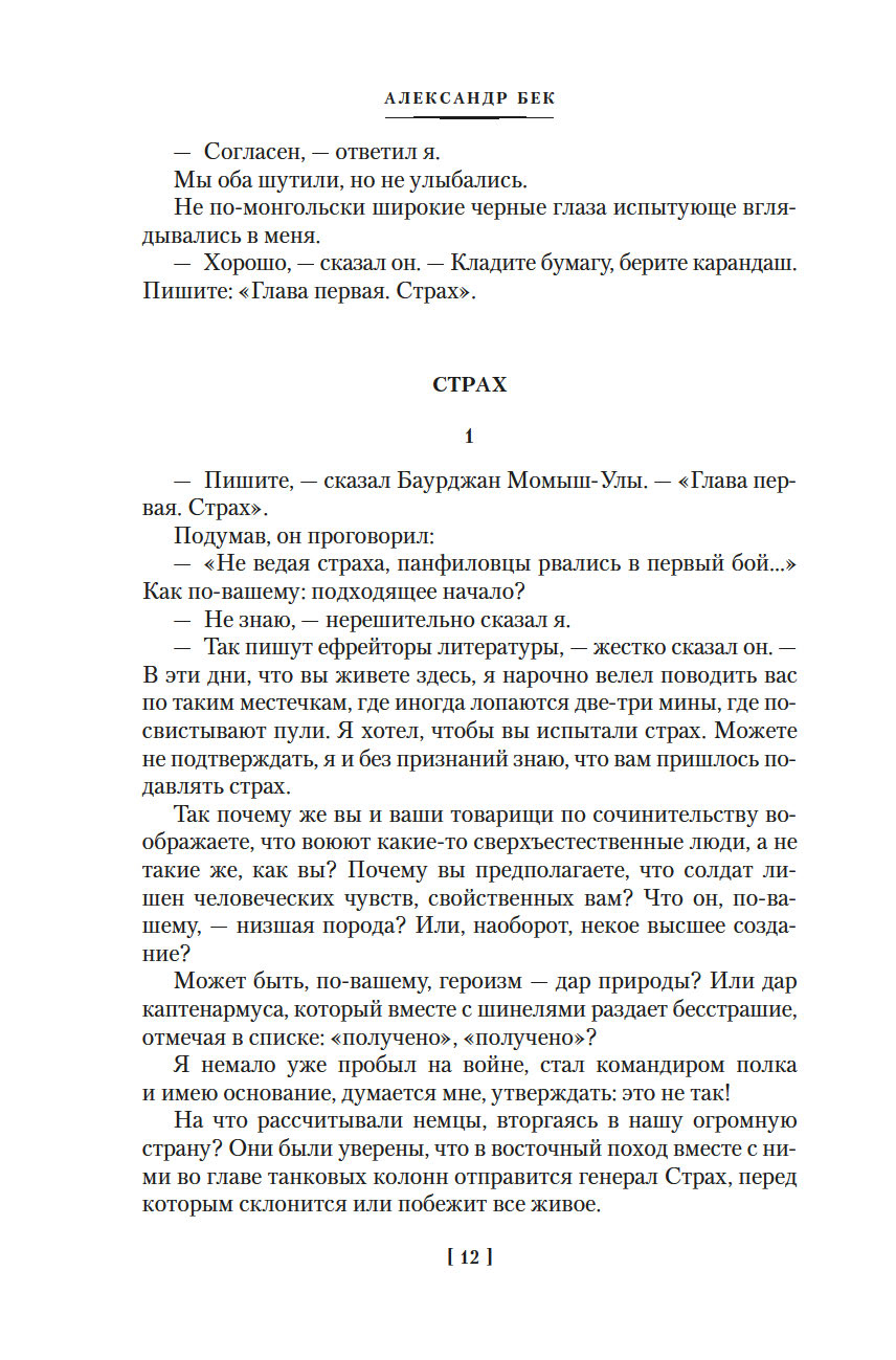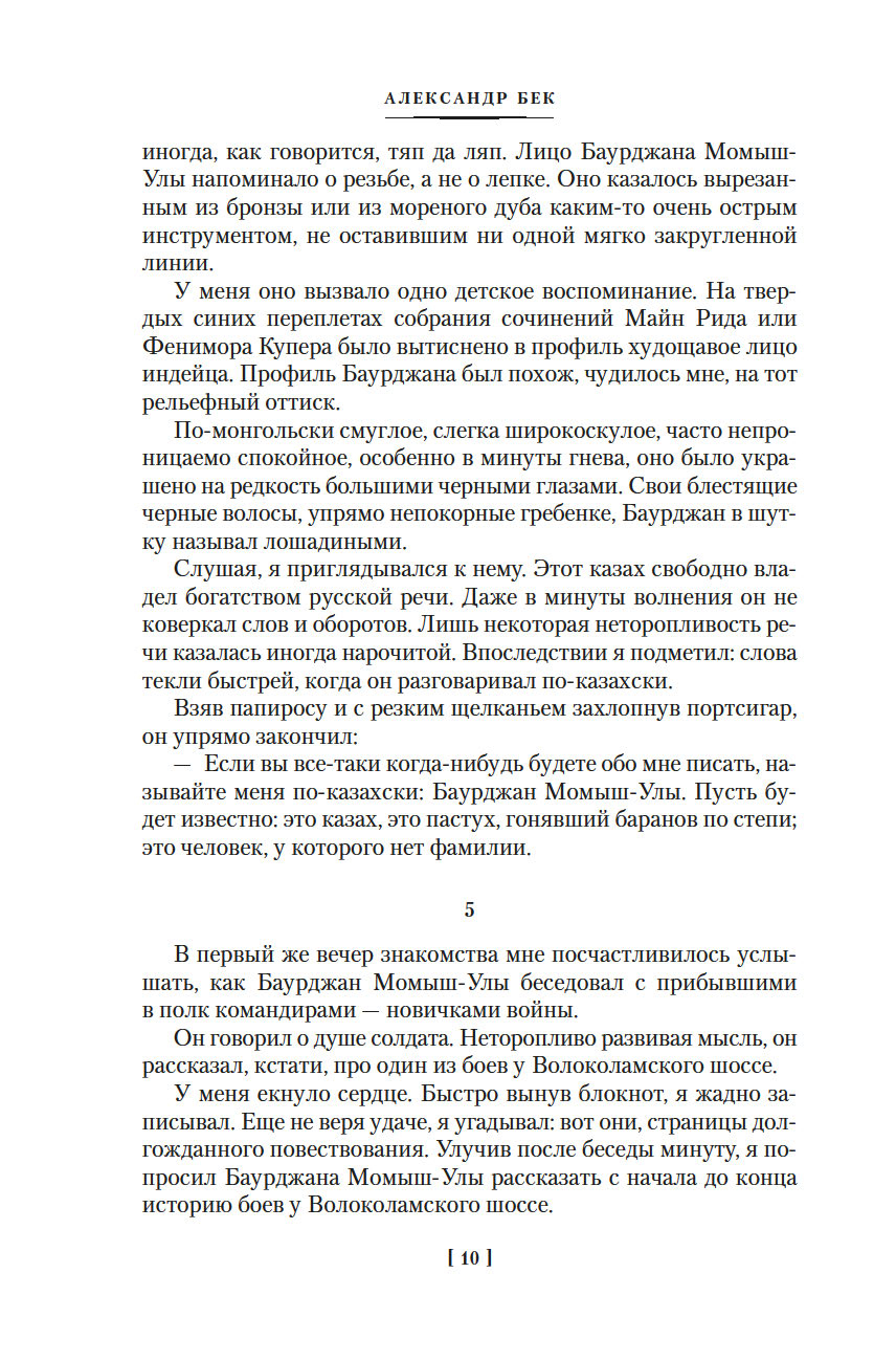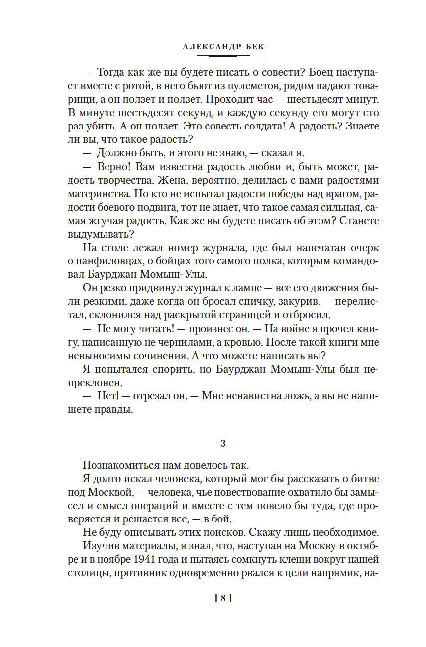 Александр Альфредович Бек (1902/03 – 1972) – русский советский писатель, участник Гражданской и Великой Отечественной войны, военный корреспондент. Центральное место в творчестве Бека занимает знаменитая тетралогия "Волоколамское шоссе", в основу которой лег подвиг Панфиловской дивизии при героической обороне Москвы в 1941 году. Повествование идет от лица старшего лейтенанта Баурджана Момыш-Улы, который командовал пехотным батальоном. Спустя всего месяц боев под Москвой реальный Момыш-Улы был назначен командиром полка, а в 1945 году возглавил дивизию, в 1990-м, посмертно, ему присвоили звание Героя Советского Союза.