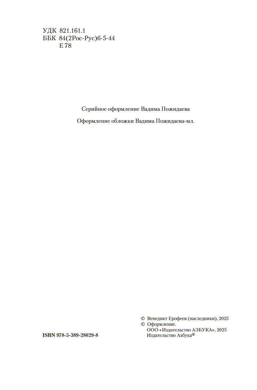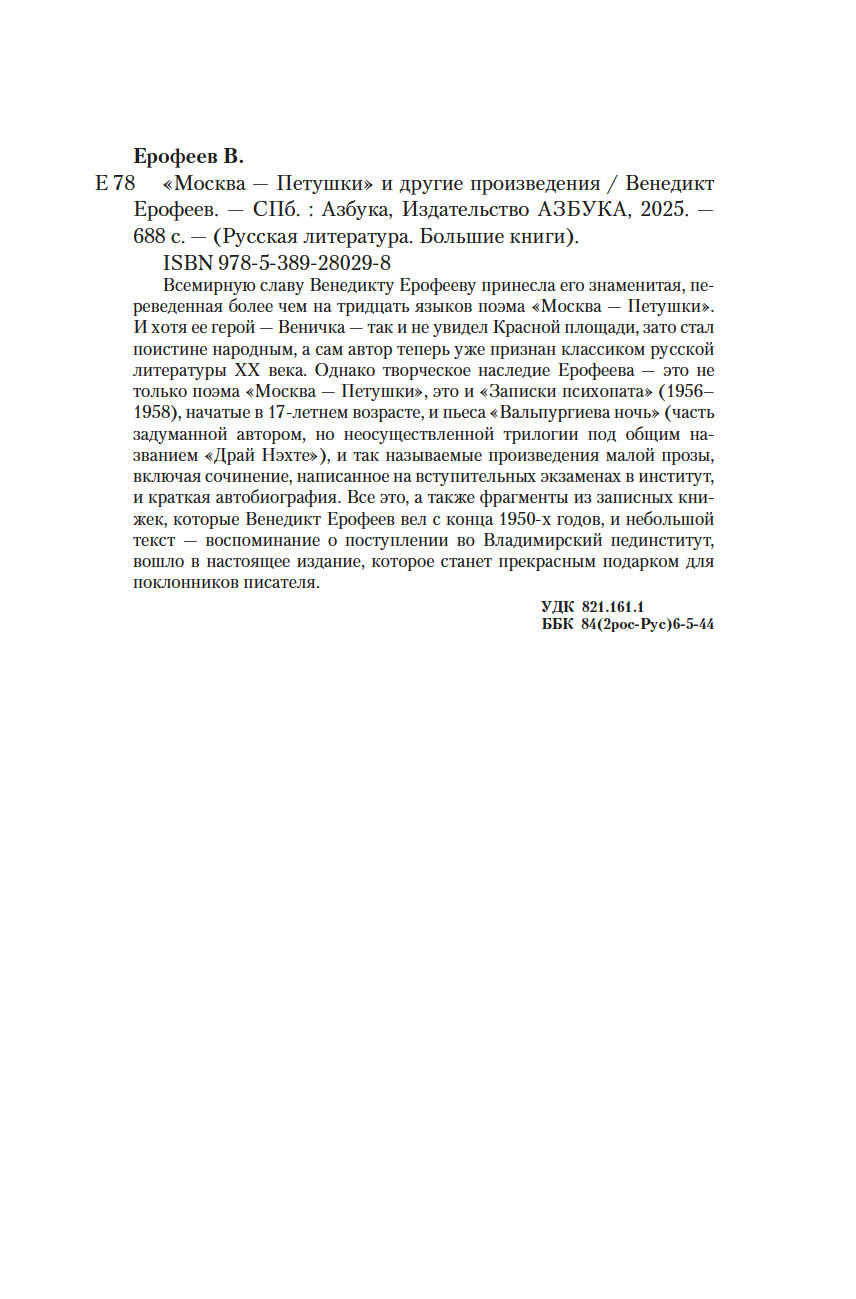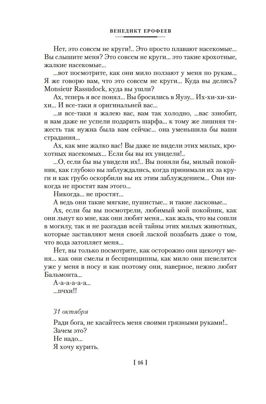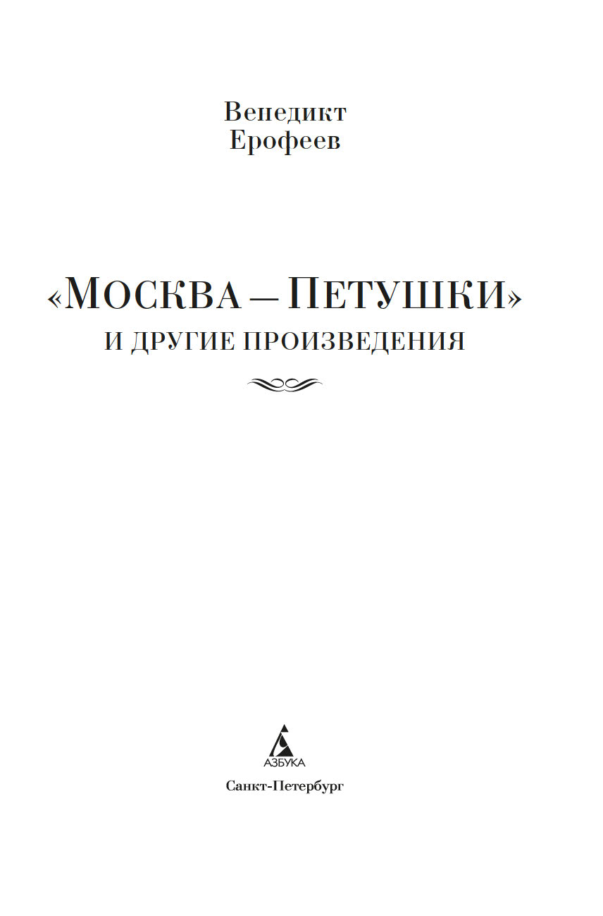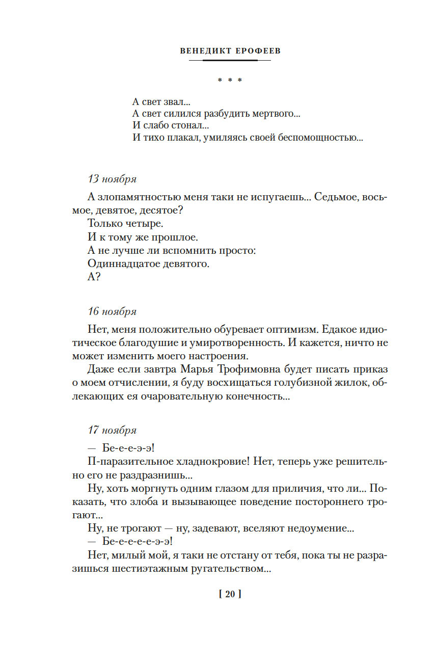 Всемирную славу Венедикту Ерофееву принесла его знаменитая, переведенная более чем на тридцать языков поэма "Москва – Петушки". И хотя ее герой – Веничка – так и не увидел Красной площади, зато стал поистине народным, а сам автор теперь уже признан классиком русской литературы ХХ века. Однако творческое наследие Ерофеева – это не только поэма "Москва – Петушки", это и "Записки психопата" (1956–1958), начатые в 17-летнем возрасте, и пьеса "Вальпургиева ночь" (часть задуманной автором, но неосуществленной трилогии под общим названием "Драй Нэхте"), и так называемые произведения малой прозы, включая сочинение, написанное на вступительных экзаменах в институт, и краткая автобиография. Все это, а также фрагменты из записных книжек, которые Венедикт Ерофеев вел с конца 1950-х годов, и небольшой текст – воспоминание о поступлении во Владимирский пединститут, вошло в настоящее издание, которое станет прекрасным подарком для поклонников писателя.