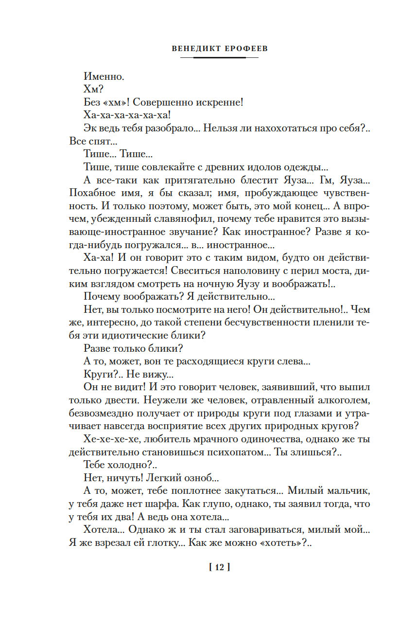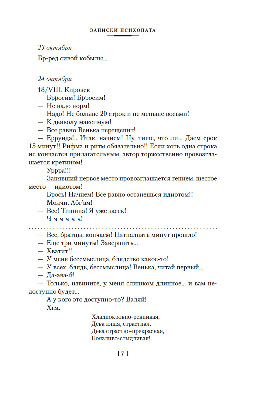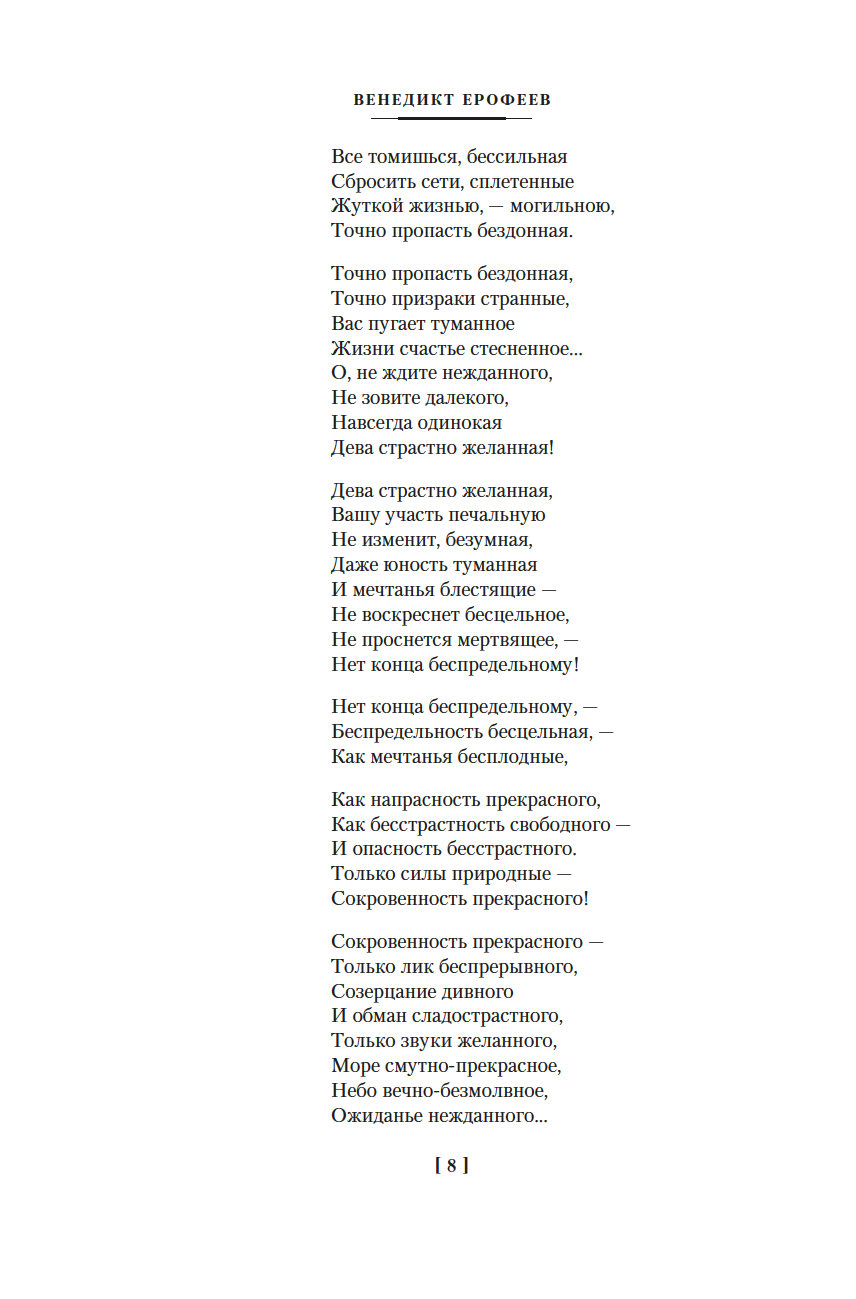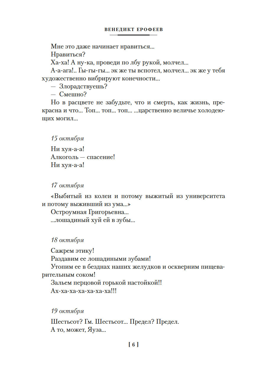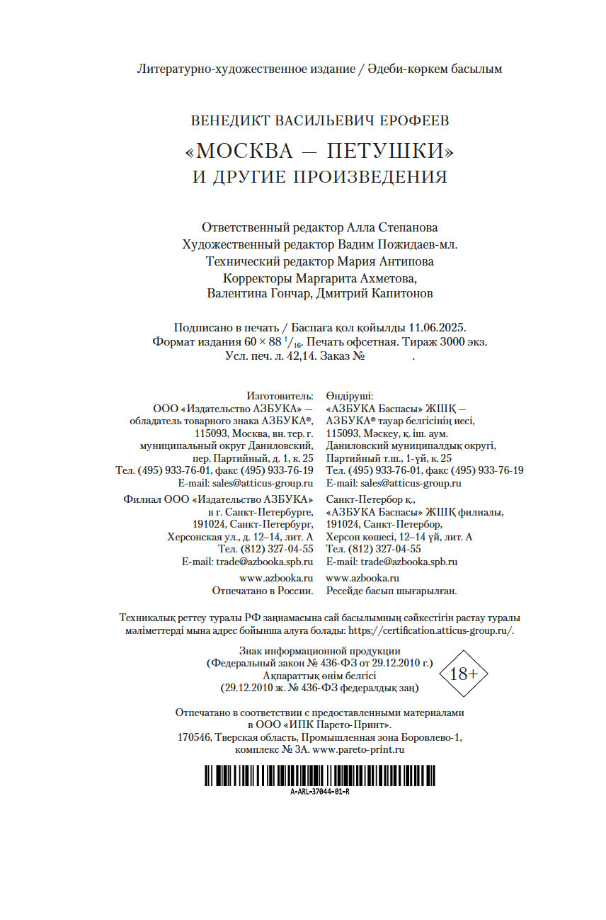 Всемирную славу Венедикту Ерофееву принесла его знаменитая, переведенная более чем на тридцать языков поэма "Москва – Петушки". И хотя ее герой – Веничка – так и не увидел Красной площади, зато стал поистине народным, а сам автор теперь уже признан классиком русской литературы ХХ века. Однако творческое наследие Ерофеева – это не только поэма "Москва – Петушки", это и "Записки психопата" (1956–1958), начатые в 17-летнем возрасте, и пьеса "Вальпургиева ночь" (часть задуманной автором, но неосуществленной трилогии под общим названием "Драй Нэхте"), и так называемые произведения малой прозы, включая сочинение, написанное на вступительных экзаменах в институт, и краткая автобиография. Все это, а также фрагменты из записных книжек, которые Венедикт Ерофеев вел с конца 1950-х годов, и небольшой текст – воспоминание о поступлении во Владимирский пединститут, вошло в настоящее издание, которое станет прекрасным подарком для поклонников писателя.