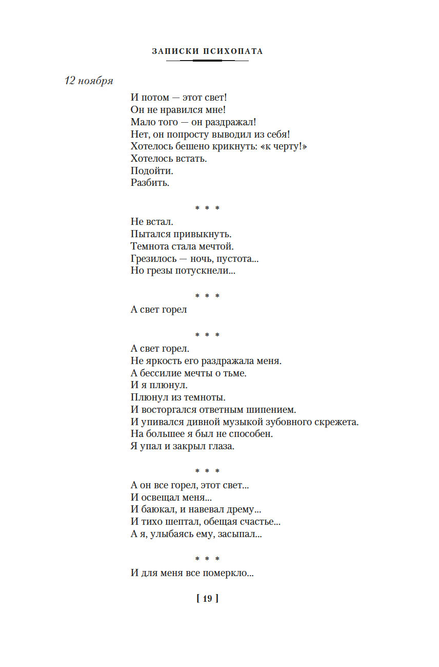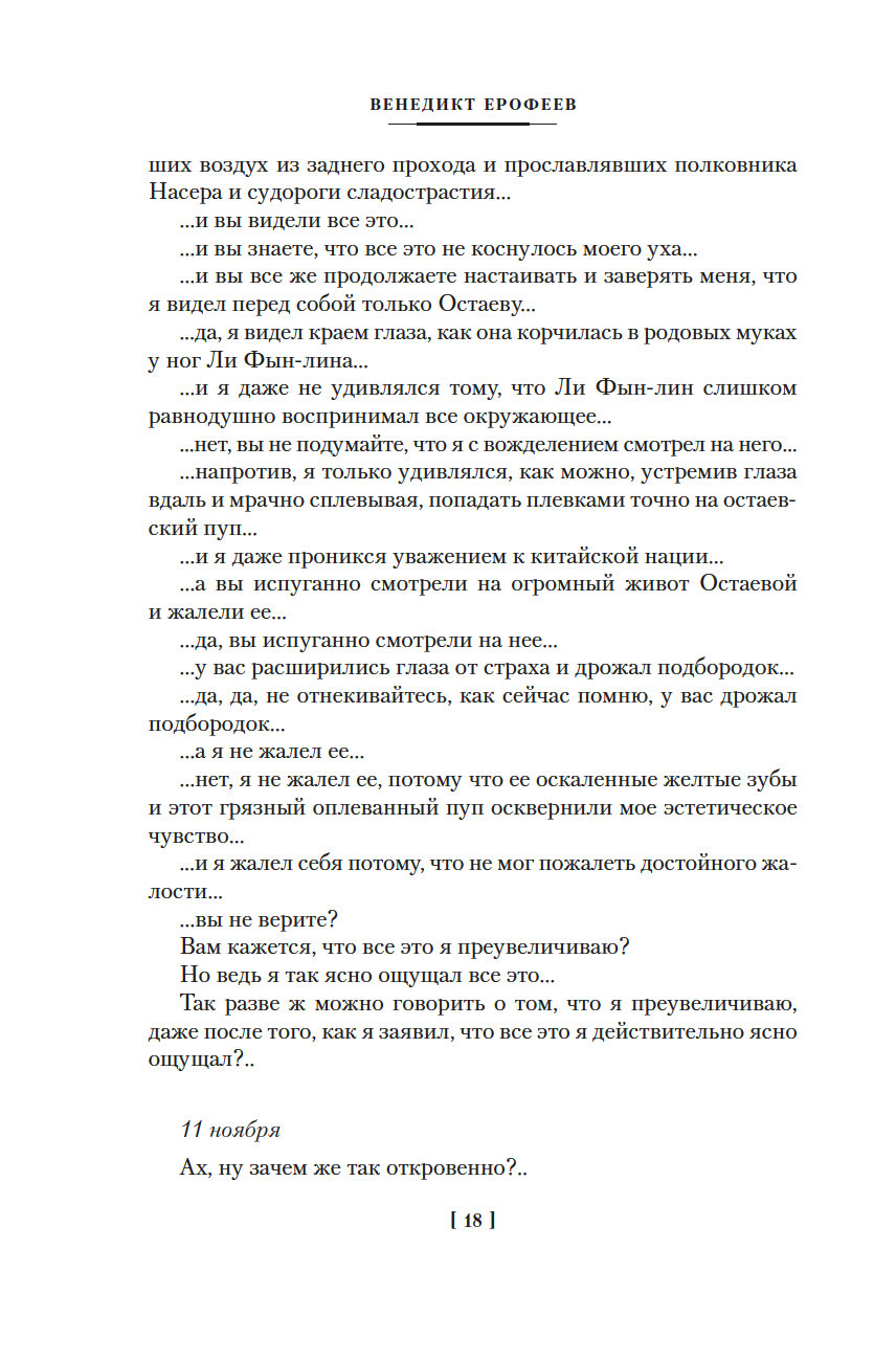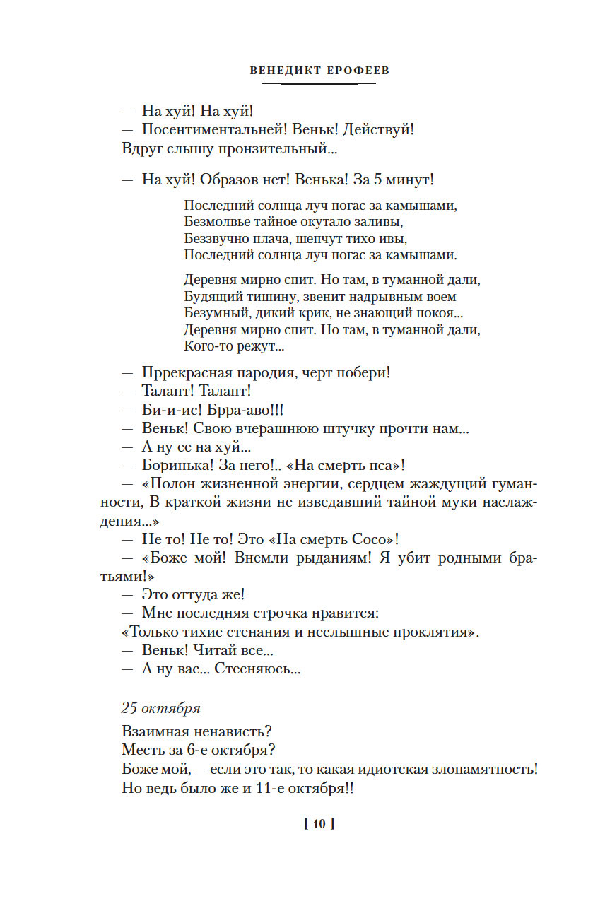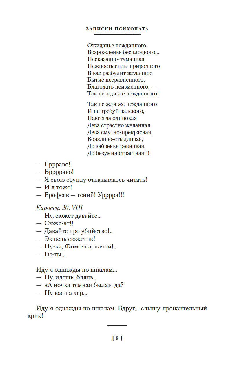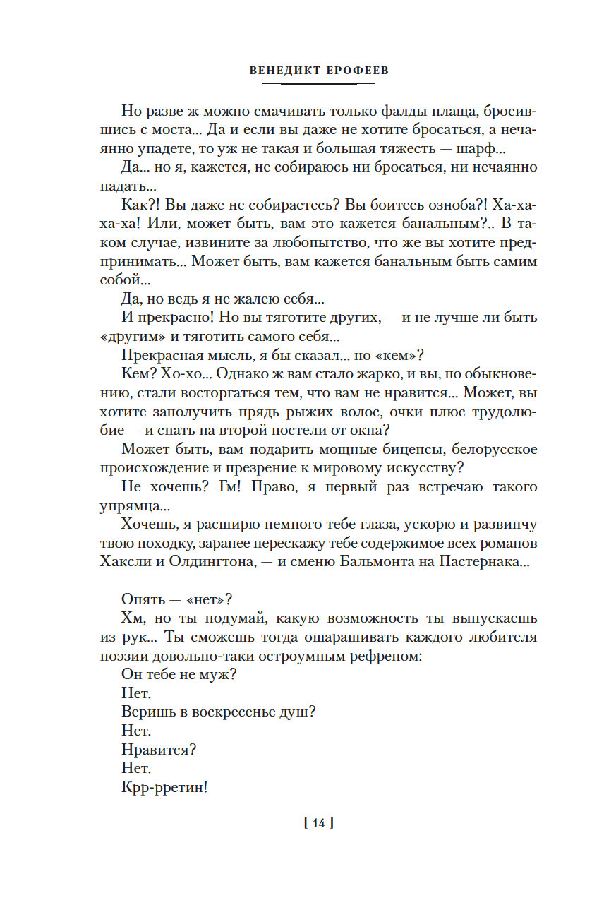 Всемирную славу Венедикту Ерофееву принесла его знаменитая, переведенная более чем на тридцать языков поэма "Москва – Петушки". И хотя ее герой – Веничка – так и не увидел Красной площади, зато стал поистине народным, а сам автор теперь уже признан классиком русской литературы ХХ века. Однако творческое наследие Ерофеева – это не только поэма "Москва – Петушки", это и "Записки психопата" (1956–1958), начатые в 17-летнем возрасте, и пьеса "Вальпургиева ночь" (часть задуманной автором, но неосуществленной трилогии под общим названием "Драй Нэхте"), и так называемые произведения малой прозы, включая сочинение, написанное на вступительных экзаменах в институт, и краткая автобиография. Все это, а также фрагменты из записных книжек, которые Венедикт Ерофеев вел с конца 1950-х годов, и небольшой текст – воспоминание о поступлении во Владимирский пединститут, вошло в настоящее издание, которое станет прекрасным подарком для поклонников писателя.