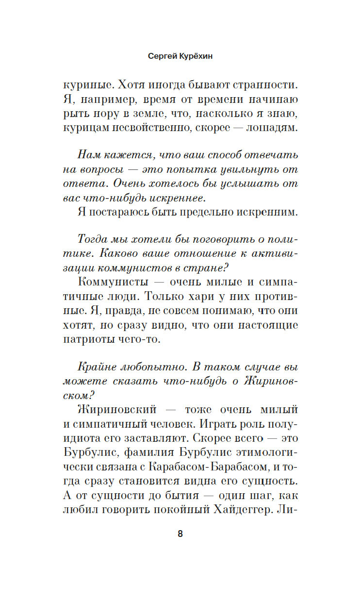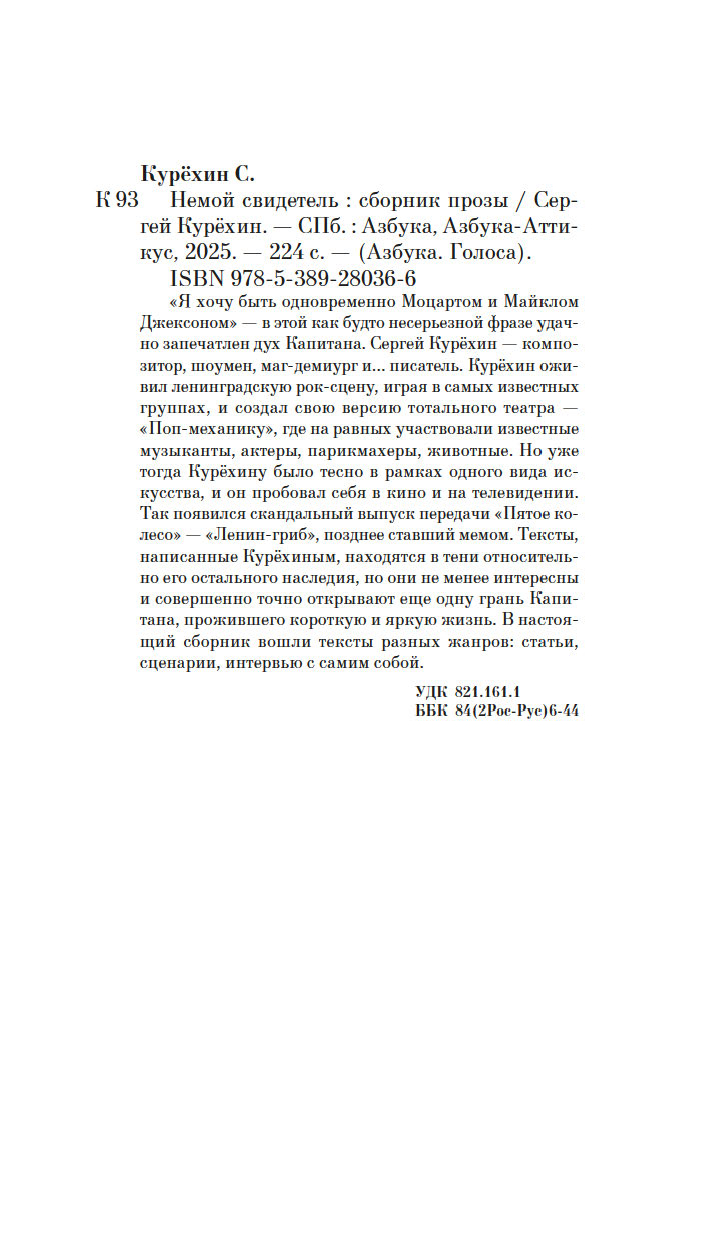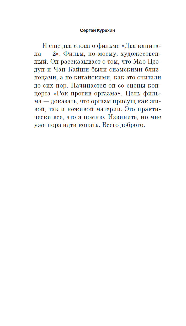 "Я хочу быть одновременно Моцартом и Майклом Джексоном" – в этой как будто несерьезной фразе удачно запечатлен дух Капитана. Сергей Курёхин – композитор, шоумен, маг-демиург и… писатель. Курёхин оживил ленинградскую рок-сцену, играя в самых известных группах, и создал свою версию тотального театра – "Поп-механику", где на равных участвовали известные музыканты, актеры, парикмахеры, животные. Но уже тогда Курёхину было тесно в рамках одного вида искусства, и он пробовал себя в кино и на телевидении. Так появился скандальный выпуск передачи "Пятое колесо" – "Ленин-гриб", позднее ставший мемом. Тексты, написанные Курёхиным, находятся в тени относительно его остального наследия, но они не менее интересны и совершенно точно открывают еще одну грань Капитана, прожившего короткую и яркую жизнь. В настоящий сборник вошли тексты разных жанров: статьи, сценарии, интервью с самим собой.