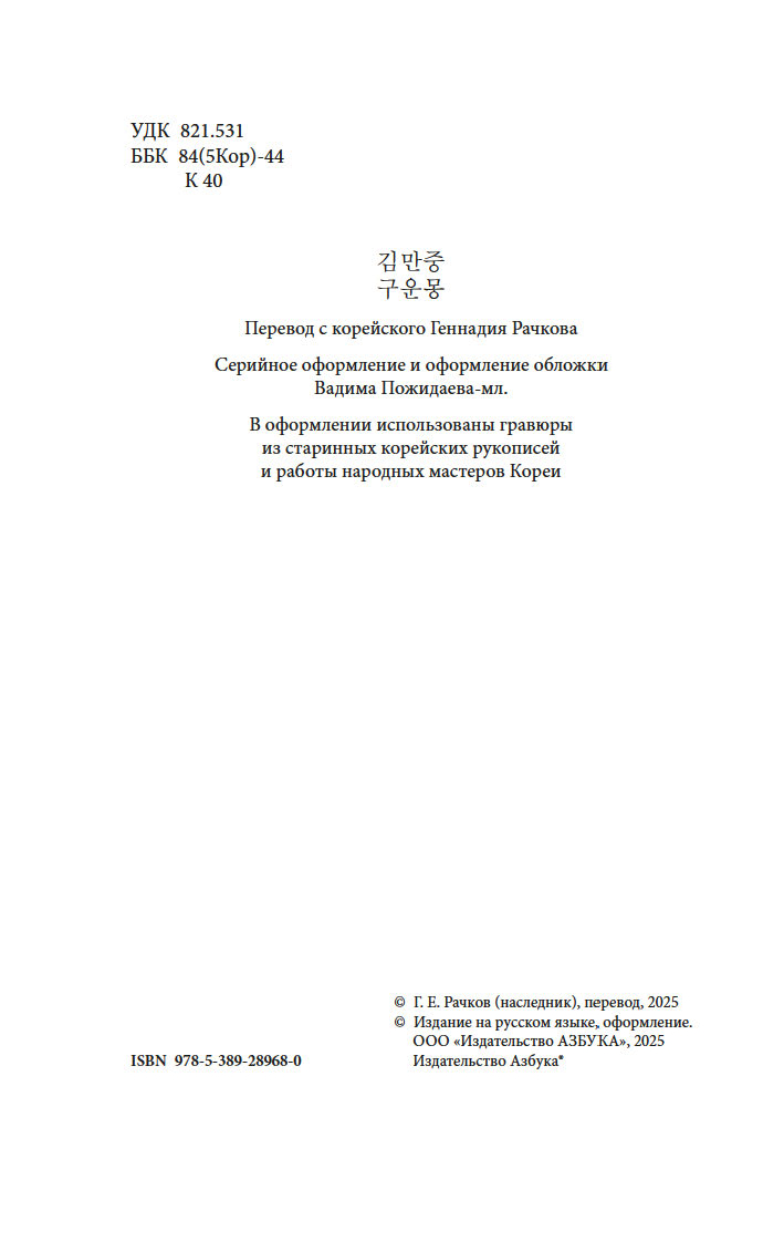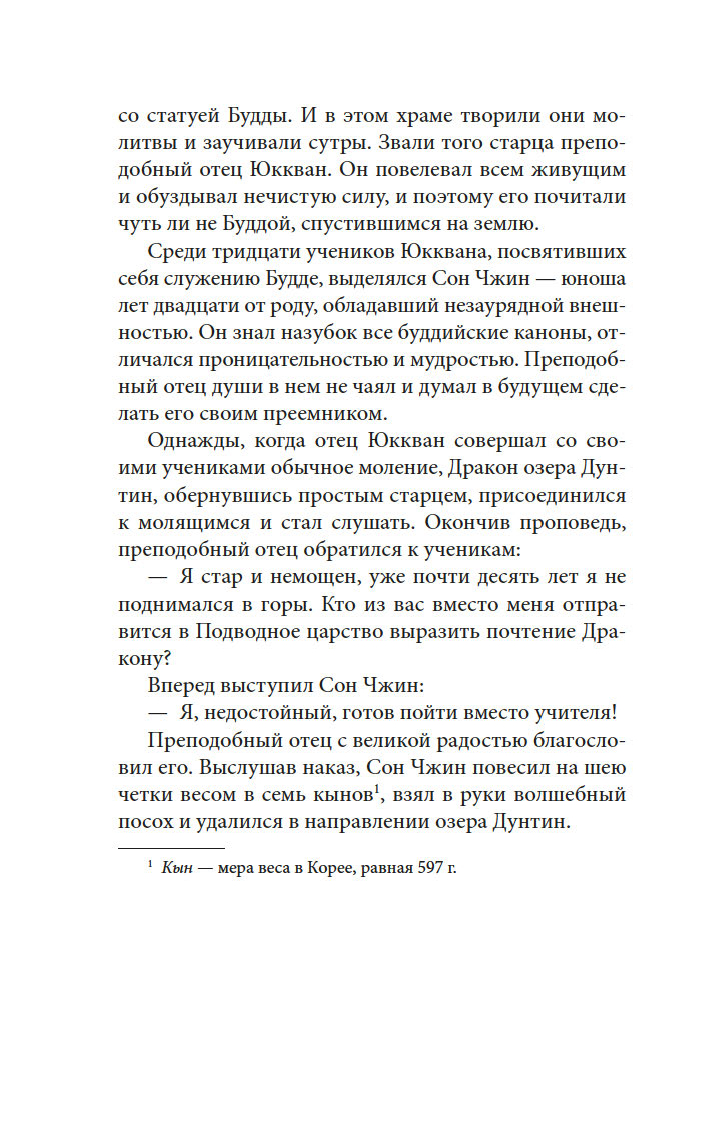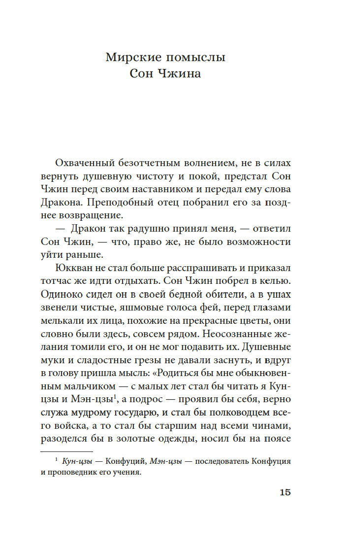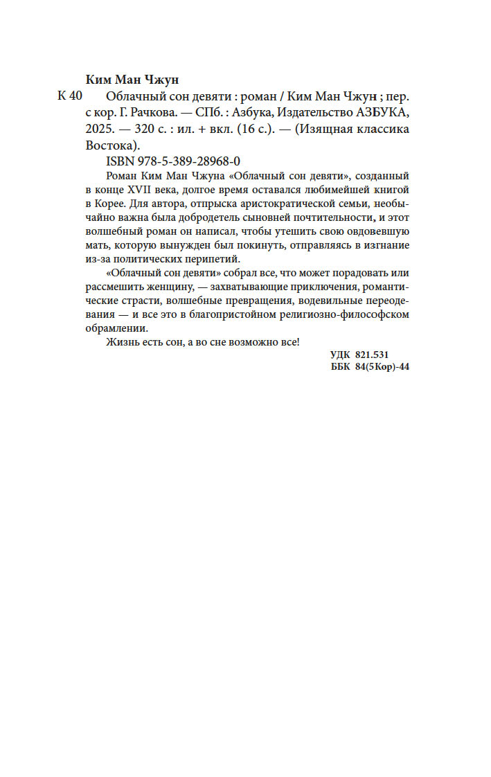 Роман Ким Ман Чжуна "Облачный сон девяти", созданный в конце XVII века, долгое время оставался любимейшей книгой в Корее. Для автора, отпрыска аристократической семьи, необычайно важна была добродетель сыновней почтительности, и этот волшебный роман он написал, чтобы утешить свою овдовевшую мать, которую вынужден был покинуть, отправляясь в изгнание из-за политических перипетий.
