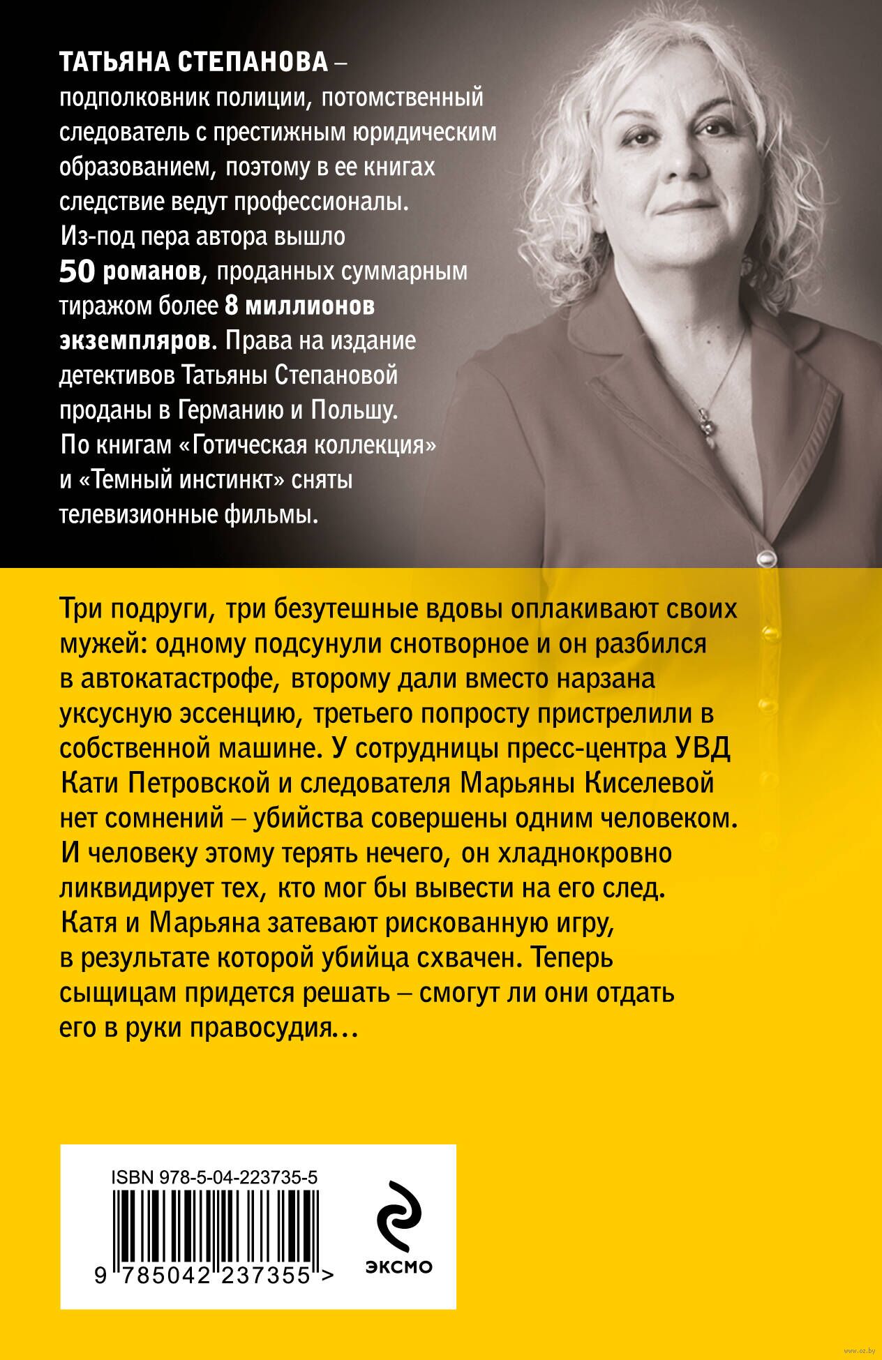 Три подруги, три безутешные вдовы, оплакивают своих мужей: одному не вовремя подсунули снотворное и он разбился в автокатастрофе, второму дали вместо нарзана уксусную эссенцию, третьего попросту пристрелили в собственной машине. У сотрудницы Пресс-центра УВД Кати Петровской и следователя Марьяны Киселевой нет сомнений – убийства совершены одним и тем же человеком. И человеку этому терять нечего, он хладнокровно ликвидирует тех, кто мог бы вывести на его след. Катя и Марьяна затевают рискованную игру, в результате которой убийца схвачен. А вот теперь сыщицам придется решить – смогут ли они отдать его в руки правосудия...