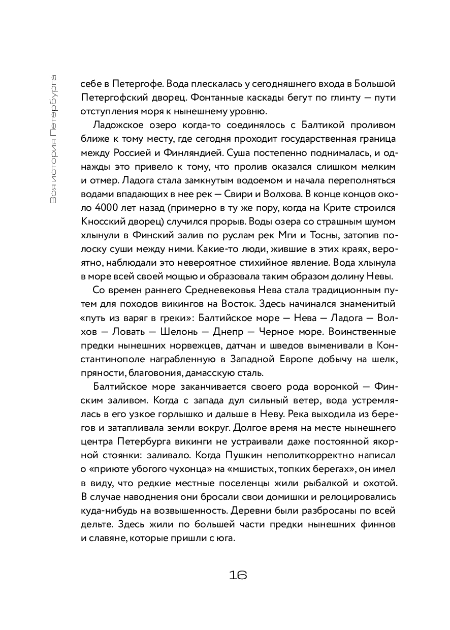 "Вся история Петербурга. От потопа и варягов до Лахта-центра и гастробаров" охватывает все стадии становления города: ранние поселения на берегах Невы, Петербург как столицу империи, индустриализацию XIX века, советский Ленинград и современный многогранный мегаполис. Авторам удалось соединить в общую канву рассказ о политических событиях и преобразованиях, важных культурных вехах и социальных явлениях, с одной стороны, и о градостроительных решениях и архитектурных стилях – с другой. "Вся история Петербурга" написана легко, и в то же время она представляет вдумчивый взгляд на город, позволяющий делать выводы не только о его прошлом, но и возможном будущем.