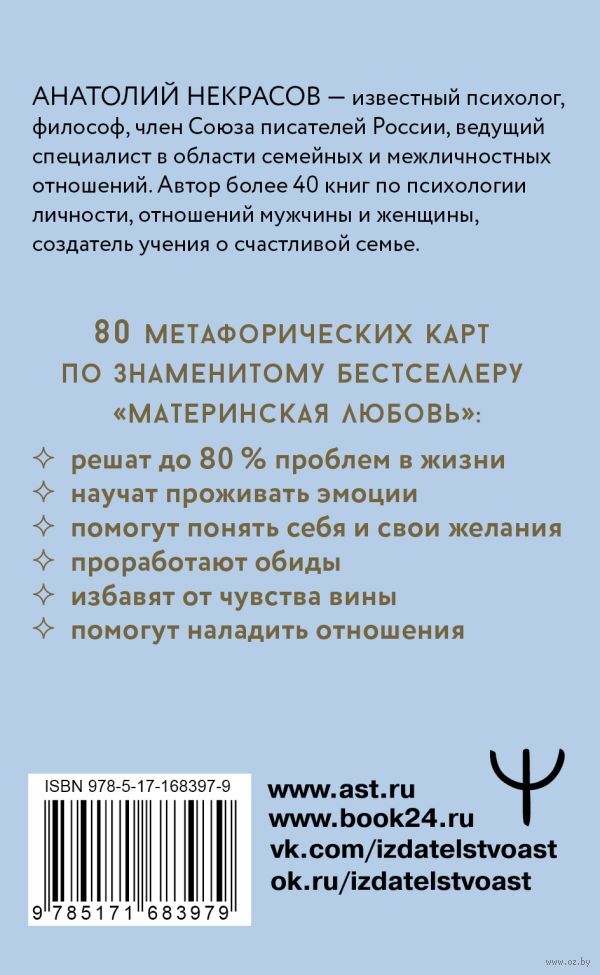 Метафорические ассоциативные карты (МАК) – инструмент психотерапии и ключ к решению многих проблем – в любви и браке, семье, общении, жизни. Авторская колода МАК от психолога, ведущего специалиста в области семейных и межличностных отношений Анатолия Некрасова – это мощный инструмент для осознания глубинного влияния материнской любви на нашу жизнь. Это одно из немногих серьезных исследований материнской любви и инструмент, который показывает истинные истоки проблем и конфликтов, помогает проработать заложенные установки и направить жизнь в позитивное русло.