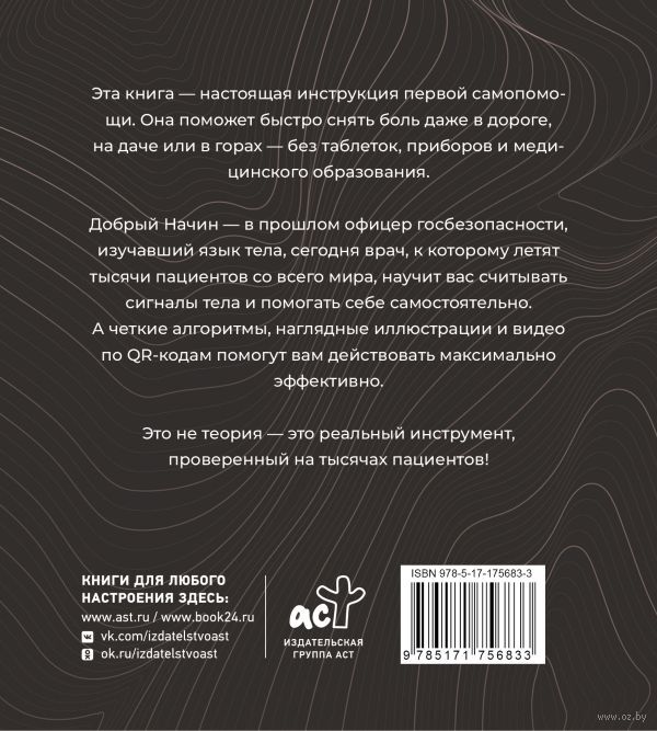 Добрый Начин – в прошлом офицер госбезопасности, изучавший язык тела, сегодня врач, к которому летят тысячи пациентов со всего мира – научит вас считывать сигналы тела и помогать себе самостоятельно. А четкие алгоритмы, наглядные иллюстрации и видео по QR-кодам помогут вам действовать максимально эффективно. Это не теория – это реальный инструмент, проверенный на тысячах пациентов!