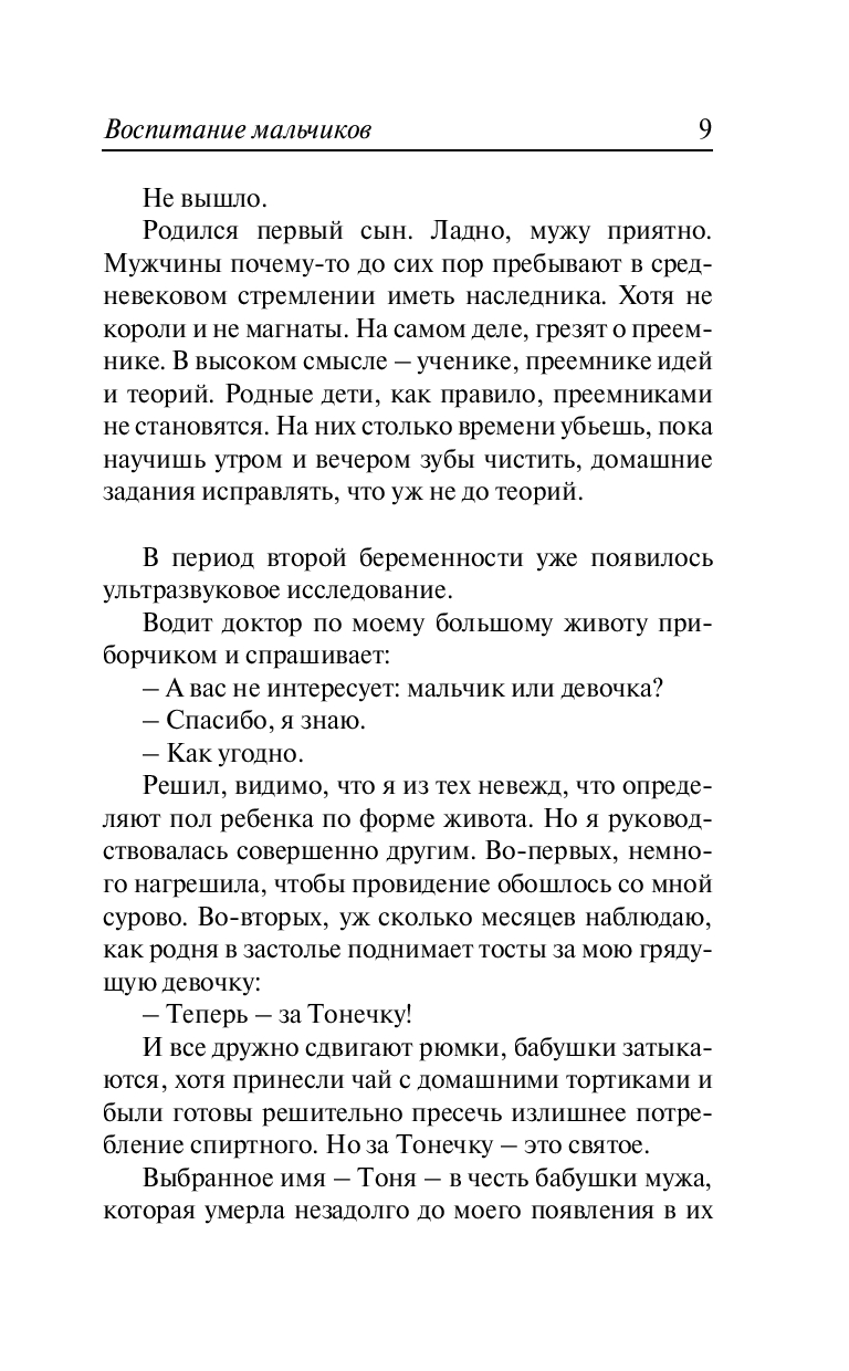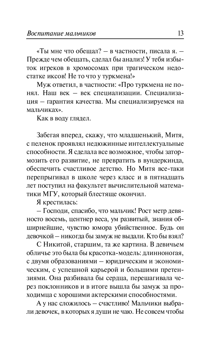 "И жили они долго и счастливо!" – именно так заканчиваются большинство прекрасных историй о любви… Постойте, но где же подробности!? Новую книгу Натальи Нестеровой можно смело назвать "жизнь после свадьбы". Писатели нередко черпают сюжеты из личного опыта. "Воспитание мальчиков" – уникальная книга, однако не совсем о воспитании и не только о детях. Каждое слово тут – о любви. И, читая ее, все становятся чуточку счастливее. Наталья Нестерова доверительно говорит о своих родных и любимых. Честно и без купюр. Это вам не выдуманные современные сказочки!