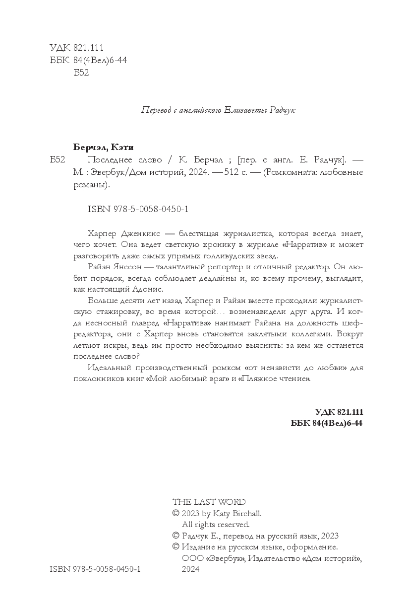 Больше десяти лет назад Харпер и Райан вместе проходили журналистскую стажировку, во время которой... возненавидели друг друга. И когда несносный главред "Нарратива" нанимает Райана на должность шеф-редактора, они с Харпер вновь становятся заклятыми коллегами. Вокруг летают искры, ведь им просто необходимо выяснить: за кем же останется последнее слово?