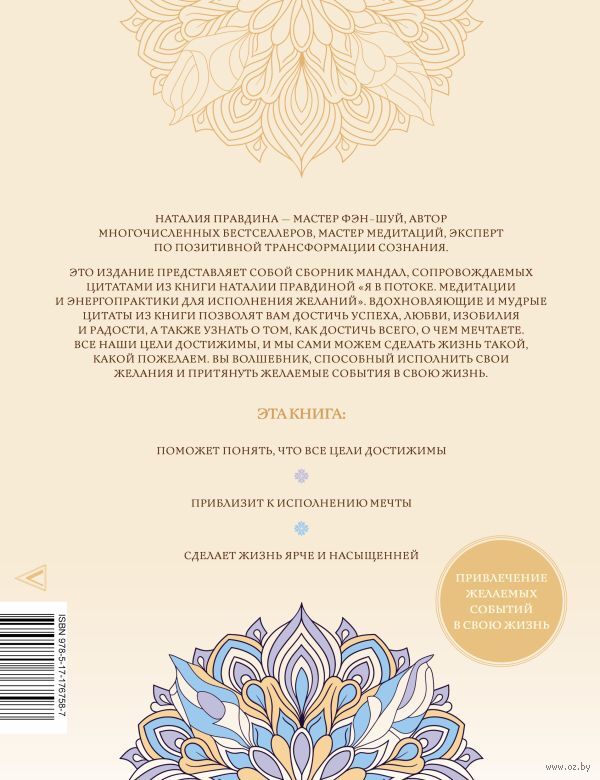 Это издание представляет собой сборник мандал, сопровождаемых цитатами из книги Наталии Правдиной "Я в потоке. Медитации и энергопрактики для исполнения желаний". Вдохновляющие и мудрые цитаты из книги позволят вам достичь успеха, любви, изобилия и радости, а также узнаете о том, как достичь всего, о чем мечтаете. Все наши цели достижимы, и мы сами можем сделать жизнь такой, какой пожелаем. Вы волшебник, способный исполнить свои желания и притянуть желаемые события в свою жизнь.