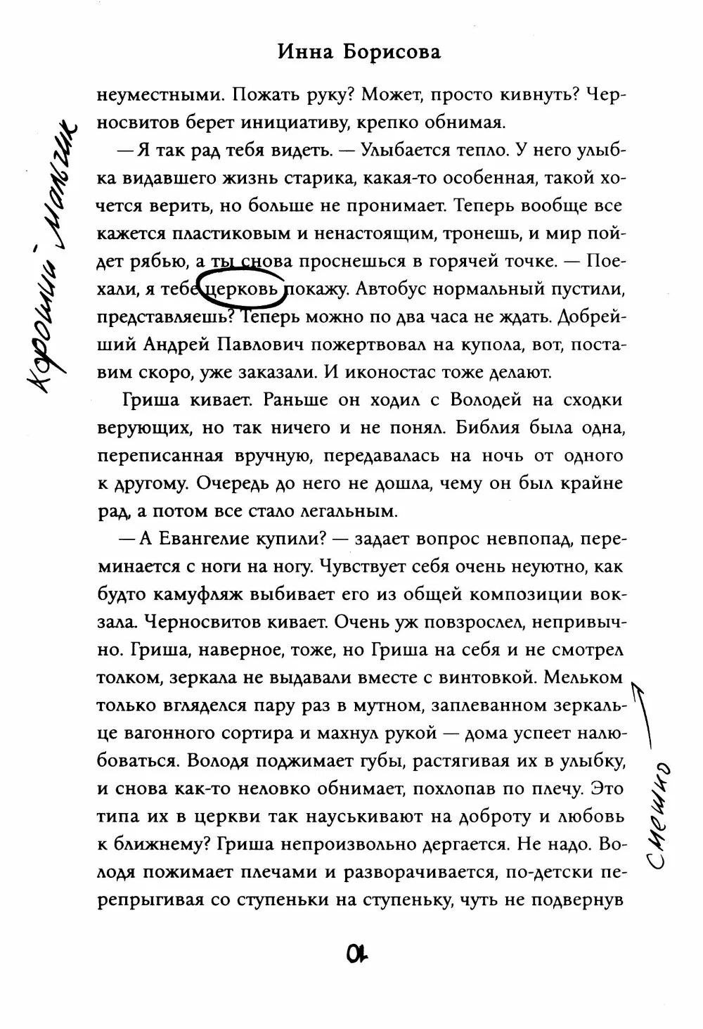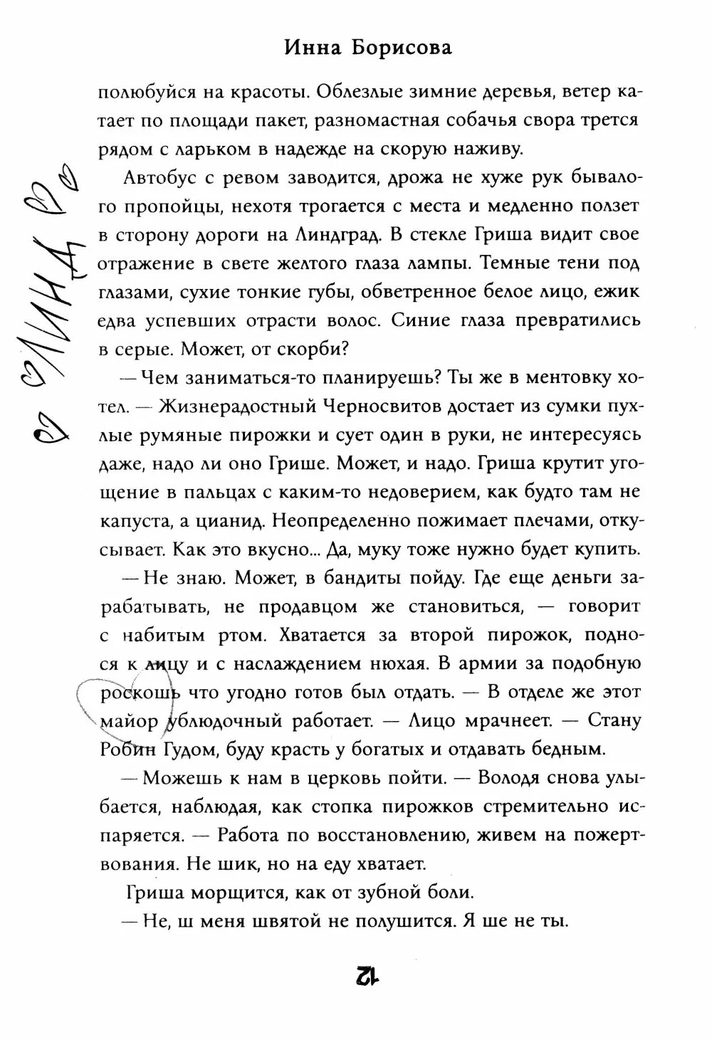 С первых страниц Инна Борисова создает интригу, добавляя в обыденные события потусторонние краски. Странные посетители, необъяснимые звуки, пугающие описания – реальность или сумасшествие? Здесь достаточно убедительно передана реальность девяностых, то, как вершились судьбы на судах законных и воровских. Как одно слово могло решить все проблемы.