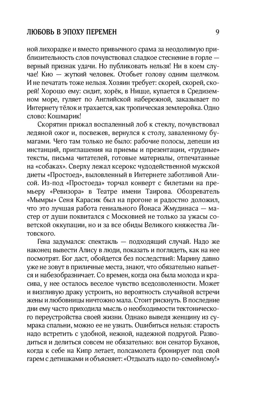 "Любовь в эпоху перемен" – это роман о романах – о нежных и сложных отношениях главного героя Геннадия Скорятина, редактора влиятельного еженедельника "Мир и мы", с тремя главными женщинами его жизни. В то же время это, по сути, первая в нашей изящной словесности попытка всерьез разобраться в перестройке, рассеять ее мифы и понять тайные пружины той эпохи. Как всегда, читателя ждут острый сюжет, яркие характеры, отточенный стиль, язвительная сатира, неожиданные сравнения, смелые эротические метафоры... В книгу также вошли публицистические статьи и эссе разных лет, тематически перекликающиеся с романом "Любовь в эпоху перемен".