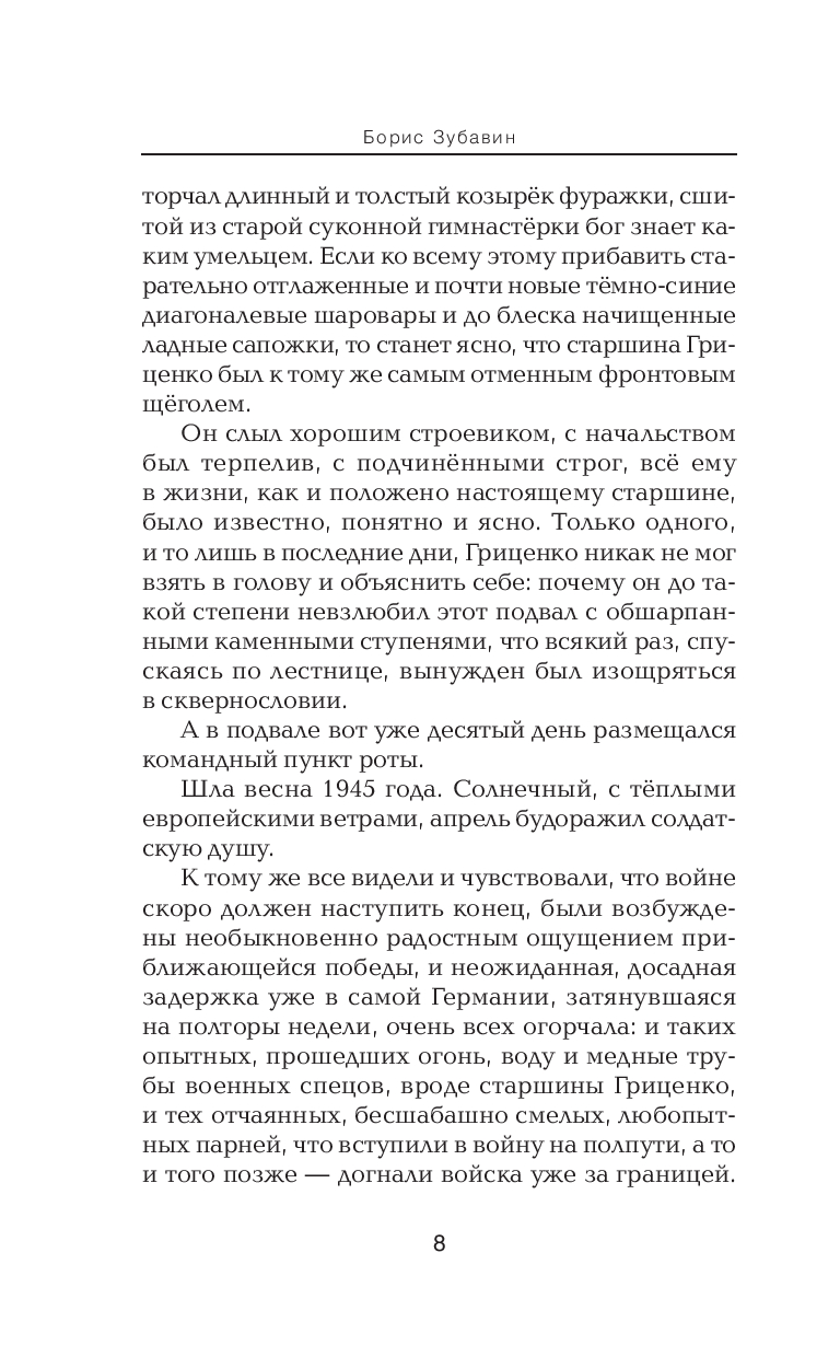 Образцовая проза о Великой Отечественной войне. О боевой работе артиллеристов, пехотинцев, разведчиков. Взгляд офицера, классическая "лейтенантская" литература. Неприкрытая правда о жестокости боёв и прославление мужества, героизма и человечности советского солдата, русского человека. Военные повести и рассказы Бориса Зубавина – важная часть литературного наследия советской эпохи, нить, протянутая к современности. Они и сейчас читаются так, словно были написаны вчера. В Россию снова пришла война, а значит, пришло время читать настоящую, честную военную прозу.