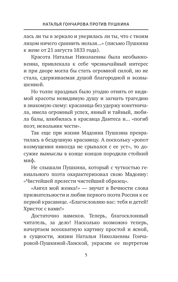 Эта книга – беспристрастное и очевидное исследование обстоятельств жизни и личных отношений Пушкина и его верной супруги, наполненное историческими материалами и проливающее свет на реальные события той эпохи.