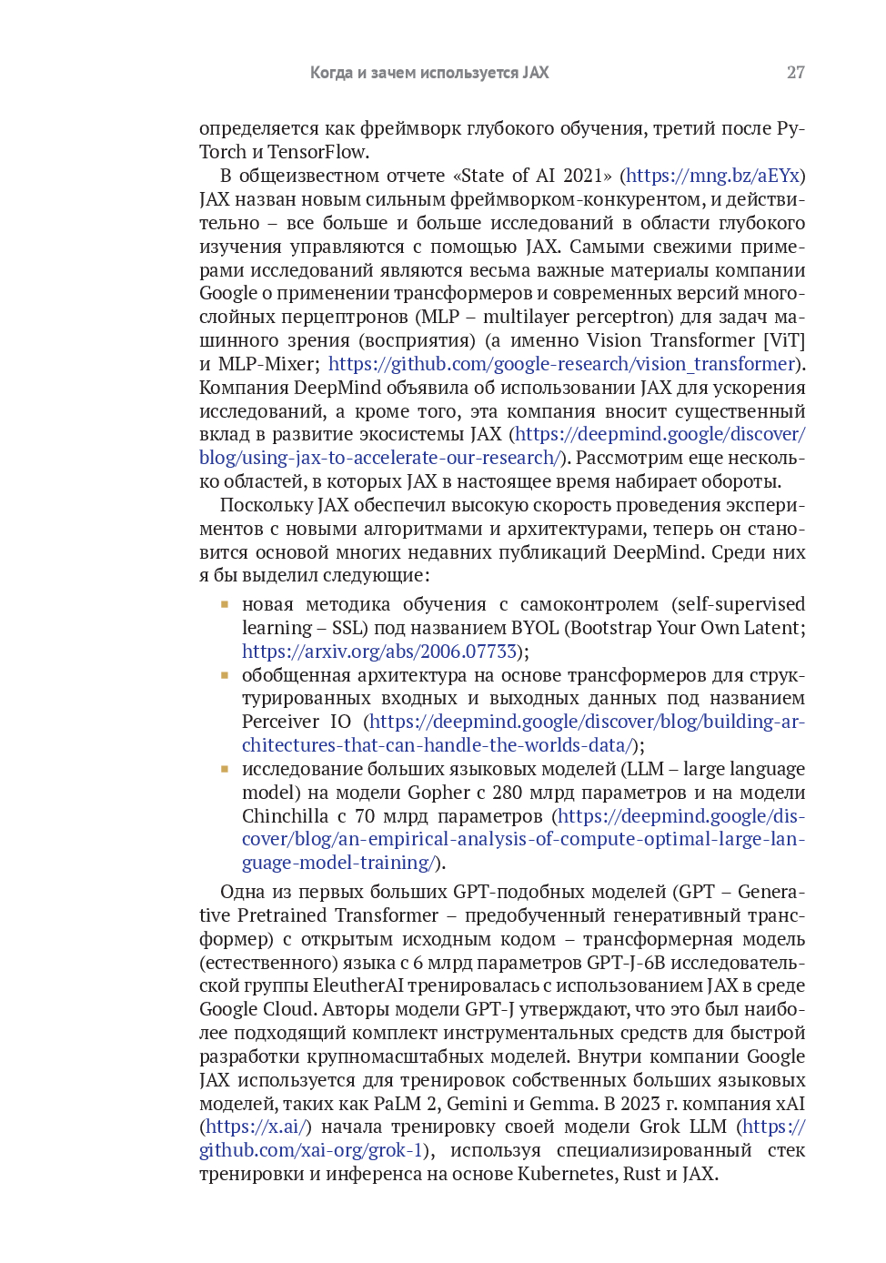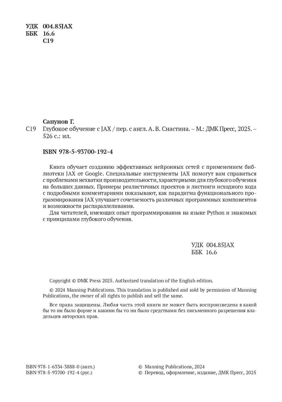 Библиотека JAX от Google предоставляет пользователям моделей глубокого обучения средства точной настройки и управления процессами низкого уровня, такими как вычисление градиента, быстрое и эффективное обучение модели и вывод результатов на больших наборах данных. Книга обучает созданию эффективных нейронных сетей с применением JAX.