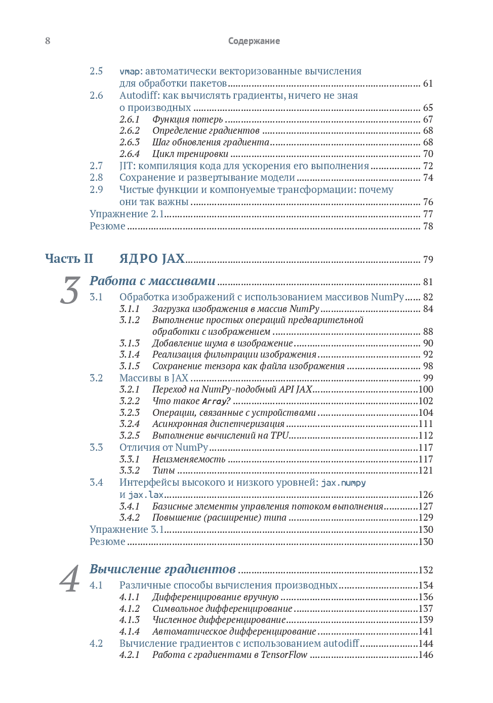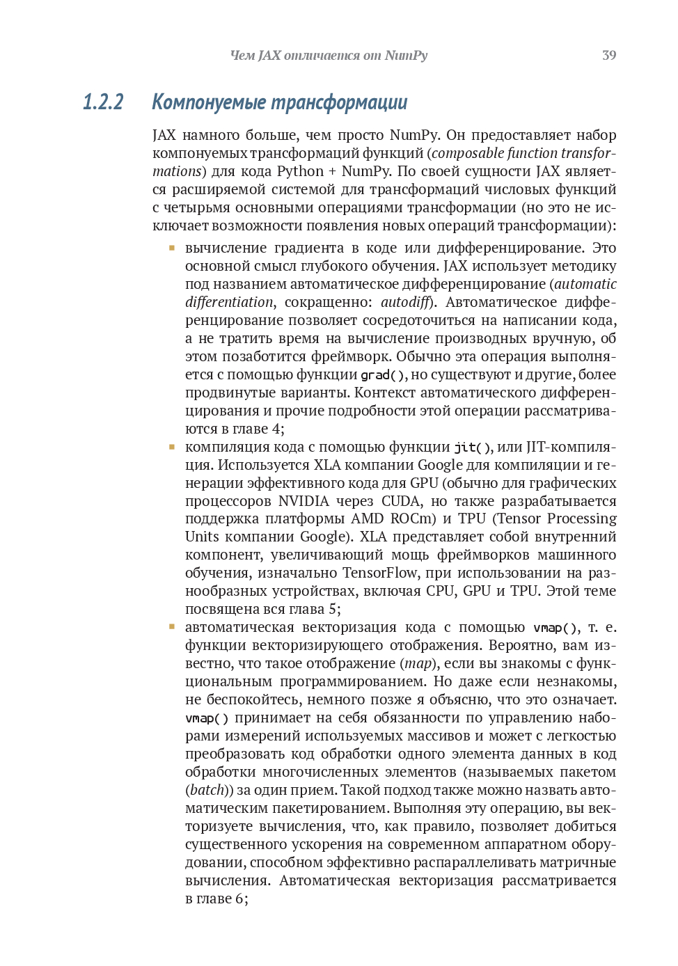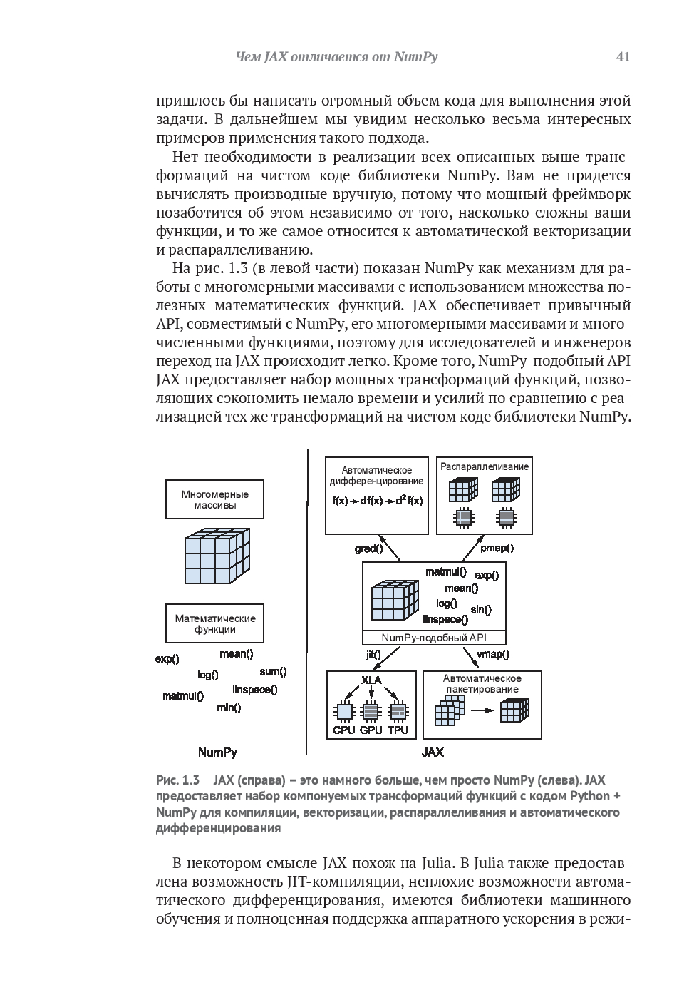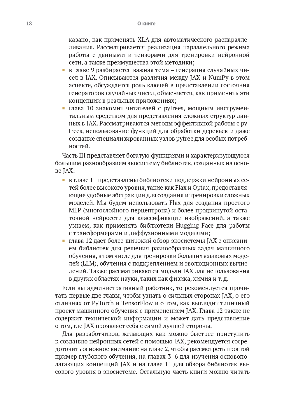 Вы узнаете, как специальные инструменты JAX помогают справиться с проблемами нехватки производительности, характерными для глубокого обучения на больших данных. Примеры реалистичных проектов и листинги исходного кода с подробными комментариями показывают, как парадигма функционального программирования JAX улучшает сочетаемость различных программных компонентов и возможности распараллеливания.