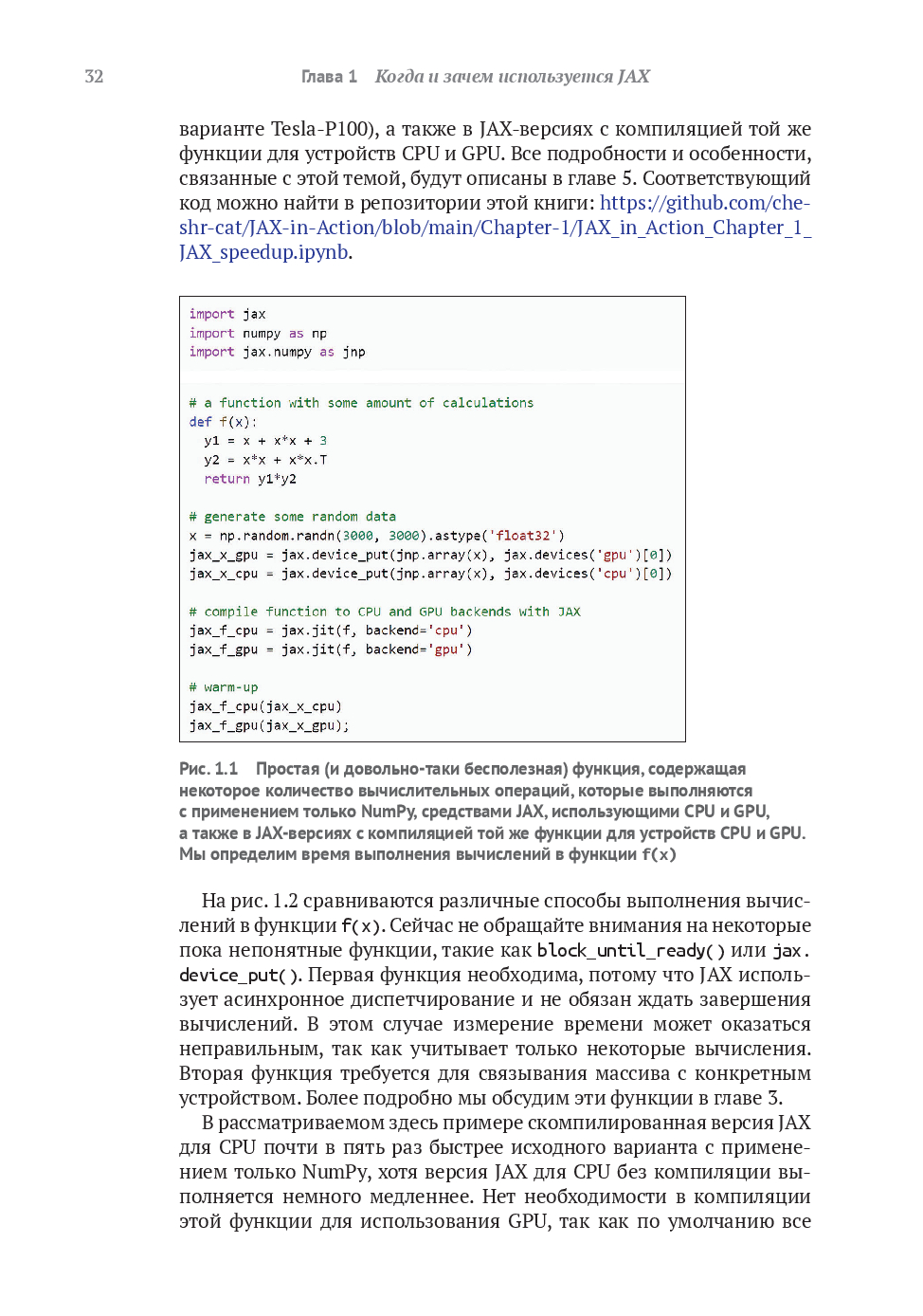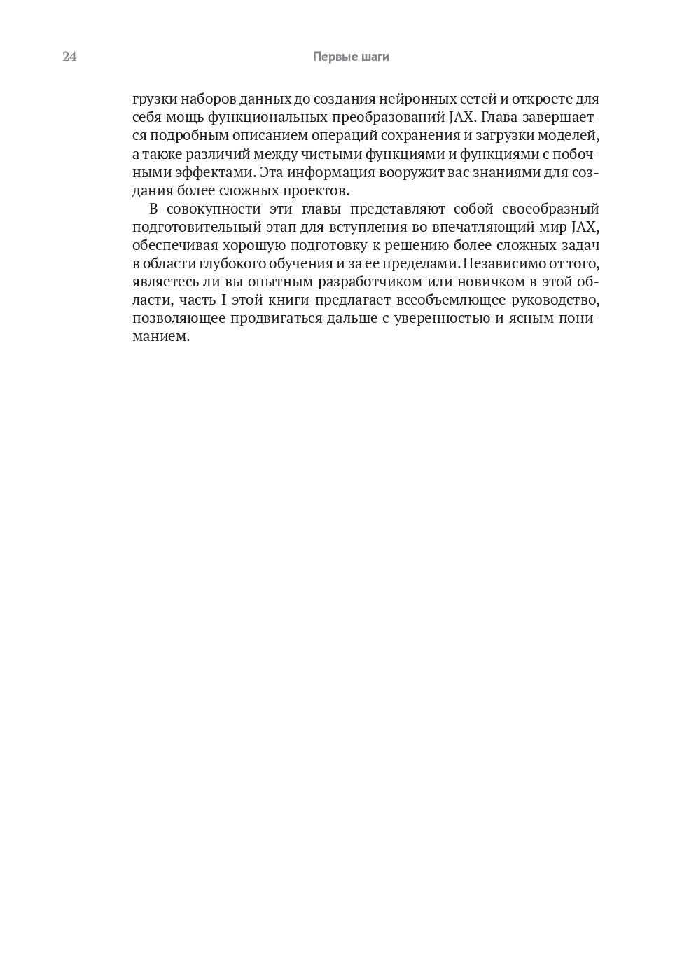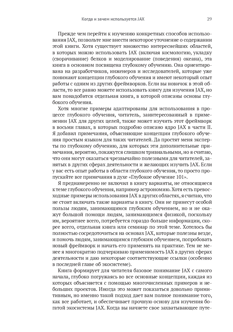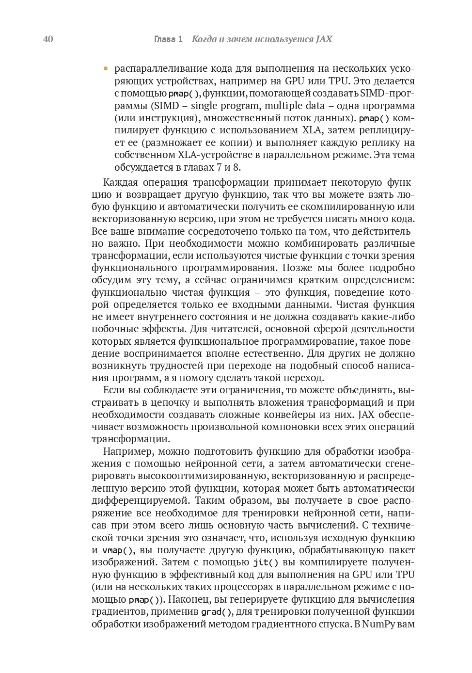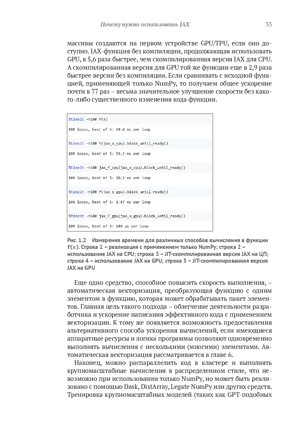 Вы узнаете, как специальные инструменты JAX помогают справиться с проблемами нехватки производительности, характерными для глубокого обучения на больших данных. Примеры реалистичных проектов и листинги исходного кода с подробными комментариями показывают, как парадигма функционального программирования JAX улучшает сочетаемость различных программных компонентов и возможности распараллеливания.