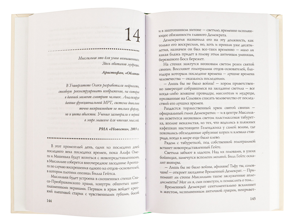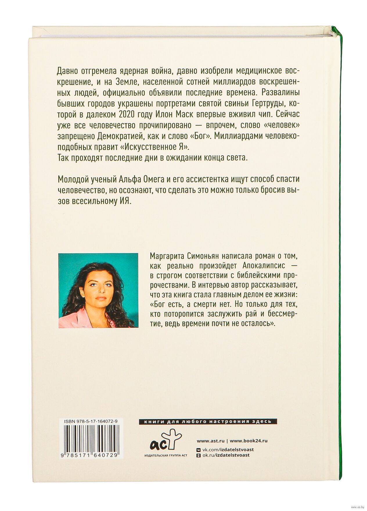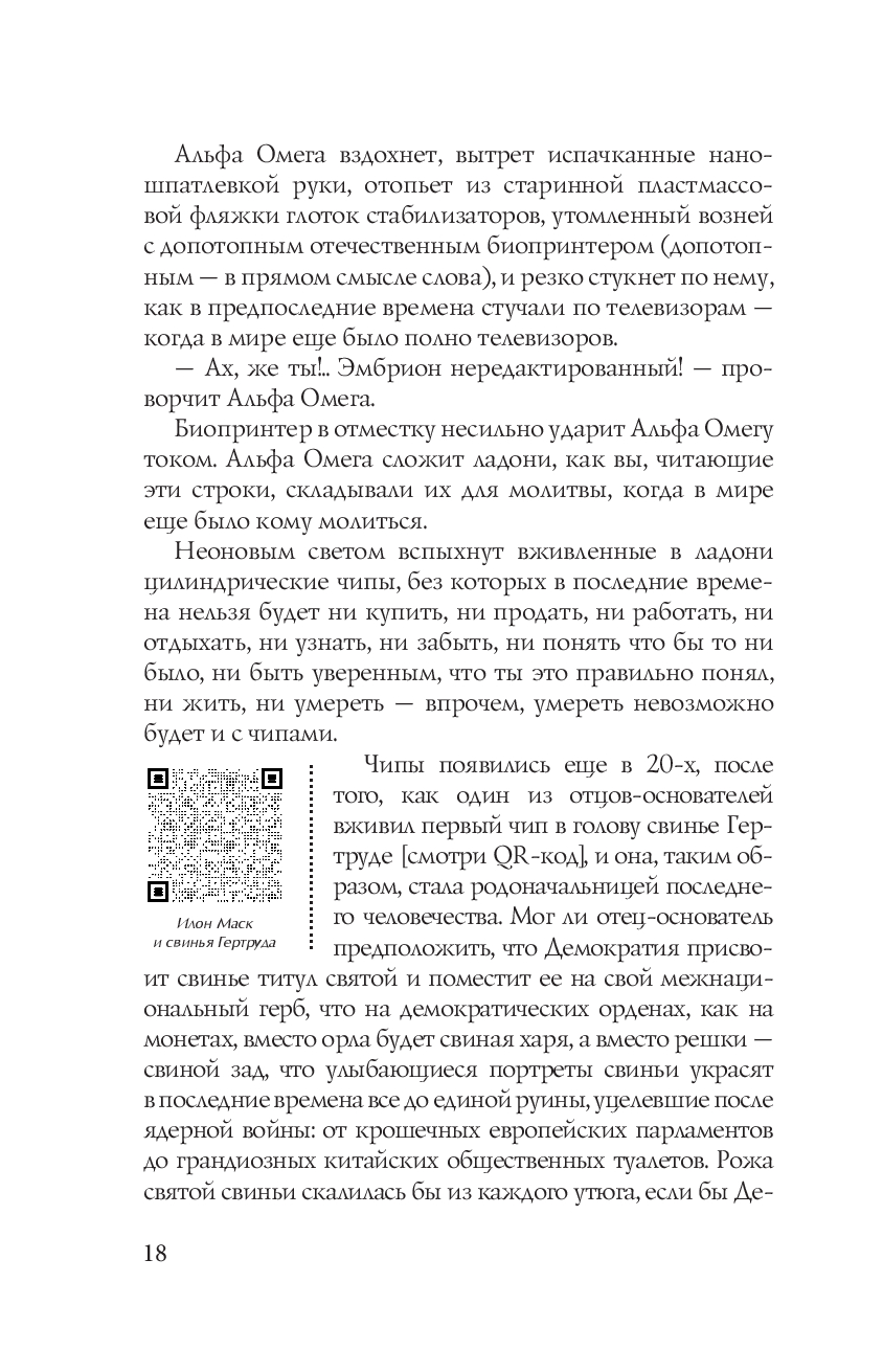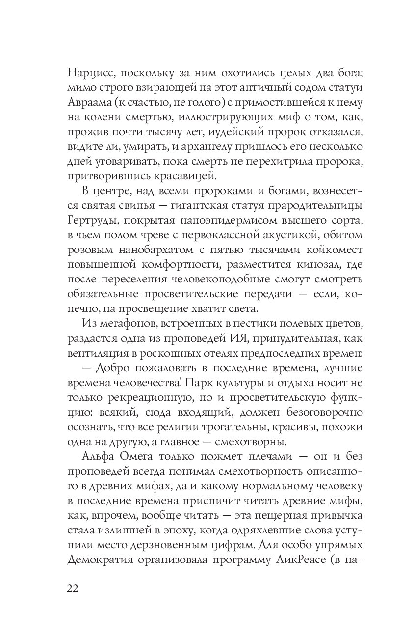 Давно отгремела ядерная война, давно изобрели медицинское воскрешение, и на Земле, населенной сотней миллиардов воскрешённых людей, официально объявили последние времена. Развалины бывших городов украшены портретами святой свиньи Гертруды, которой в далеком 2020 году Илон Маск впервые вживил чип. Сейчас уже все человечество прочипировано – впрочем, слово "человек" запрещено Демократией, как и слово "Бог". Миллиардами человекоподобных правит "Искусственное Я".