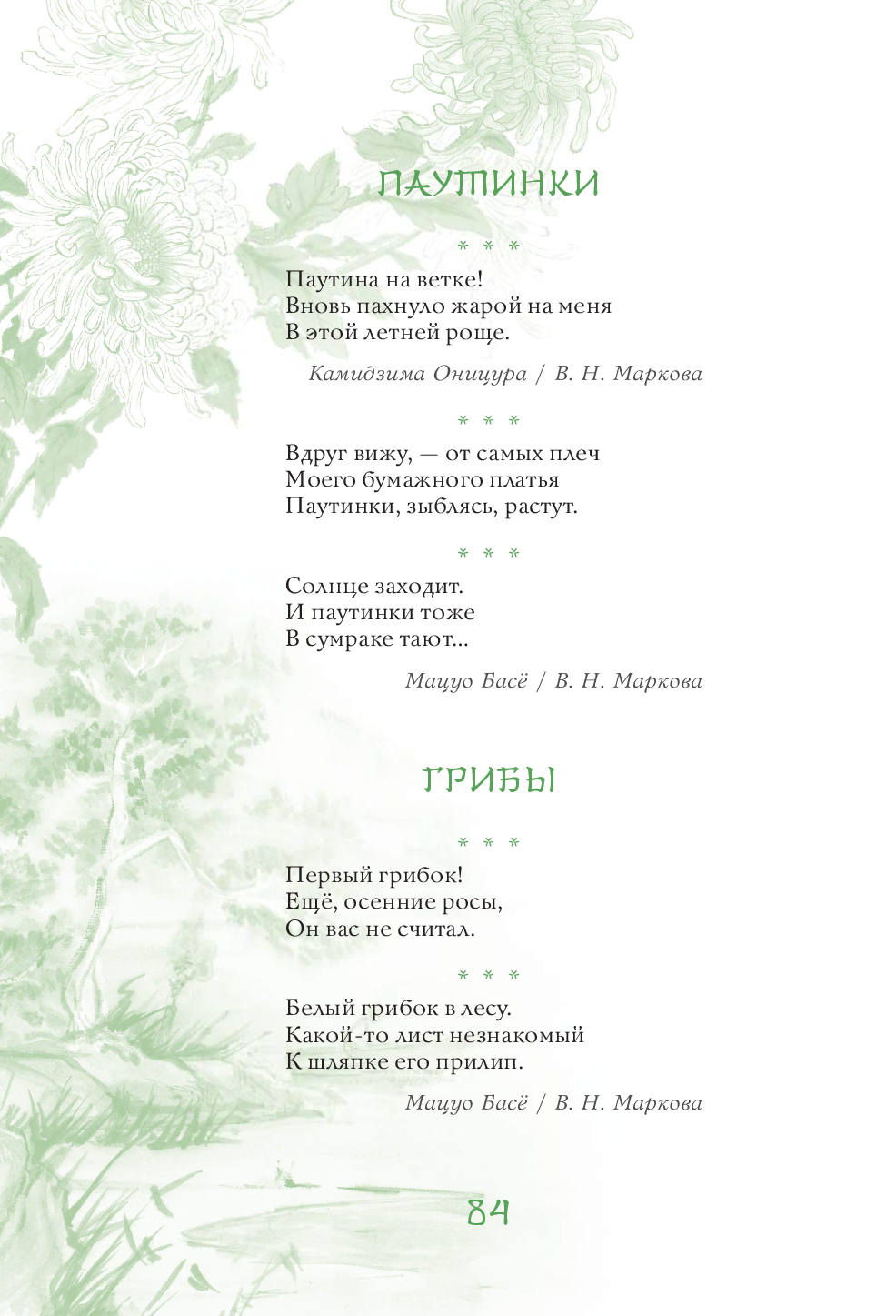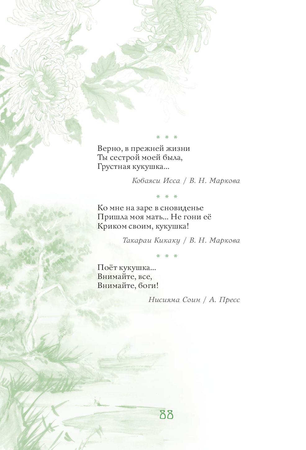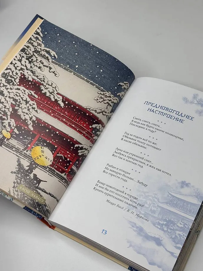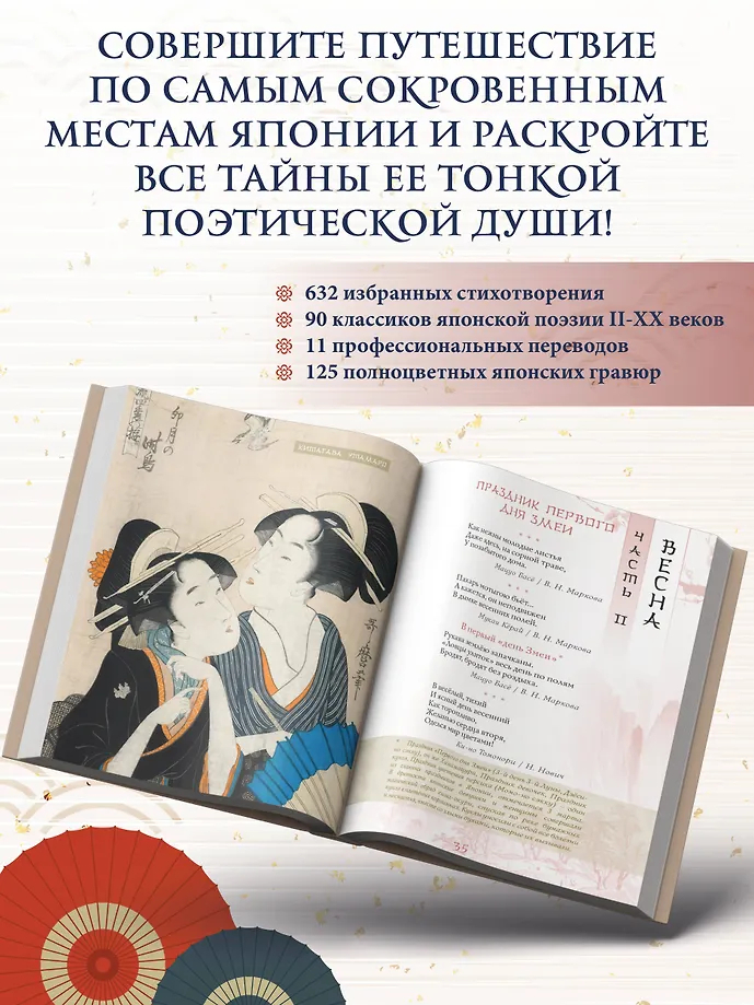 Эта книга – поэтическое путешествие по Японии, в ходе которого читатель поднимется на вершины самых известных гор и заглянет в рыбацкую харчевню у моря, полюбуется Луной 16-ой ночи и цветением сакуры, послушает колокольный звон, крик кукушки и плач оленя, поучаствует в ловле сверчков и сборе урожая риса, узнает тайну легендарного камня лисицы, побывает на праздниках Первого дня Змеи, Встречи двух звёзд, Ханами, Танабата и Цукими, попробует вино с лепестками хризантем и по достоинству оценит красоту всех времён года. Более 630 хокку 90 японских классиков в переводах Н. Азбелева, К. Бальмонта, А. Бранта, В. Марковой, В. Март, В. Мендрина, Н. Новича, А. Пресс, Г. Рачинского, П. Сухотина и М. Ямагучи, проиллюстрированные старинными японскими картинами и гравюрами, откроют читателю двери в удивительный мир японского мироощущения и созерцания.