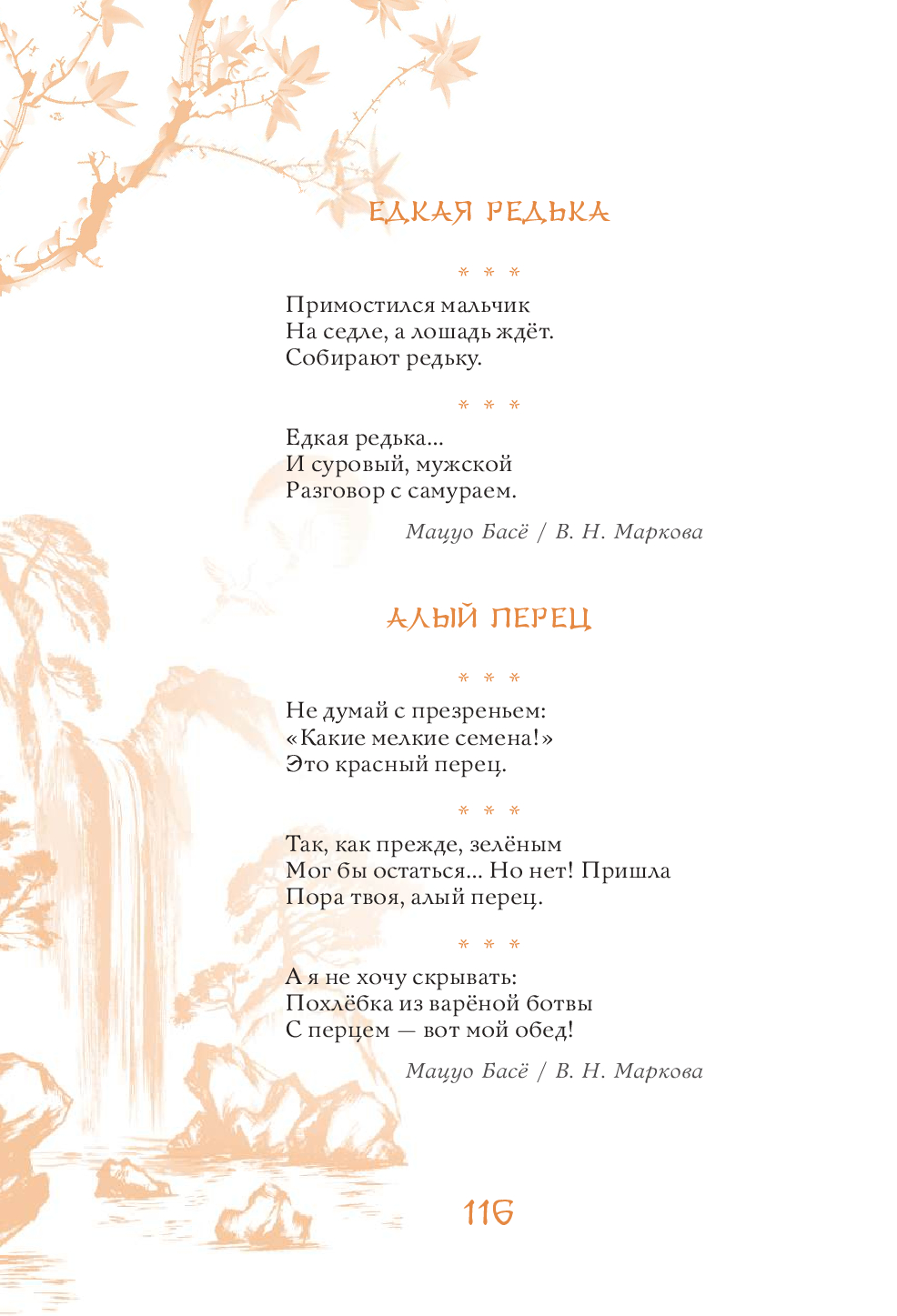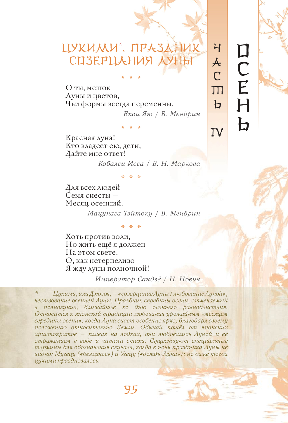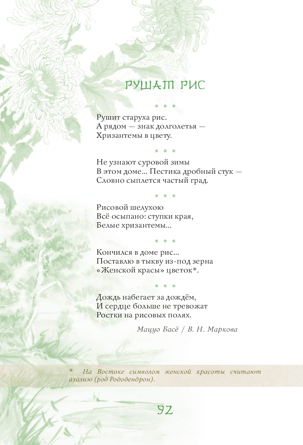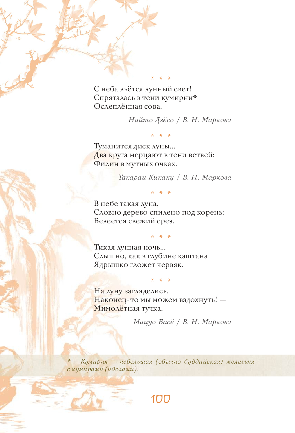 Эта книга – поэтическое путешествие по Японии, в ходе которого читатель поднимется на вершины самых известных гор и заглянет в рыбацкую харчевню у моря, полюбуется Луной 16-ой ночи и цветением сакуры, послушает колокольный звон, крик кукушки и плач оленя, поучаствует в ловле сверчков и сборе урожая риса, узнает тайну легендарного камня лисицы, побывает на праздниках Первого дня Змеи, Встречи двух звёзд, Ханами, Танабата и Цукими, попробует вино с лепестками хризантем и по достоинству оценит красоту всех времён года. Более 630 хокку 90 японских классиков в переводах Н. Азбелева, К. Бальмонта, А. Бранта, В. Марковой, В. Март, В. Мендрина, Н. Новича, А. Пресс, Г. Рачинского, П. Сухотина и М. Ямагучи, проиллюстрированные старинными японскими картинами и гравюрами, откроют читателю двери в удивительный мир японского мироощущения и созерцания.