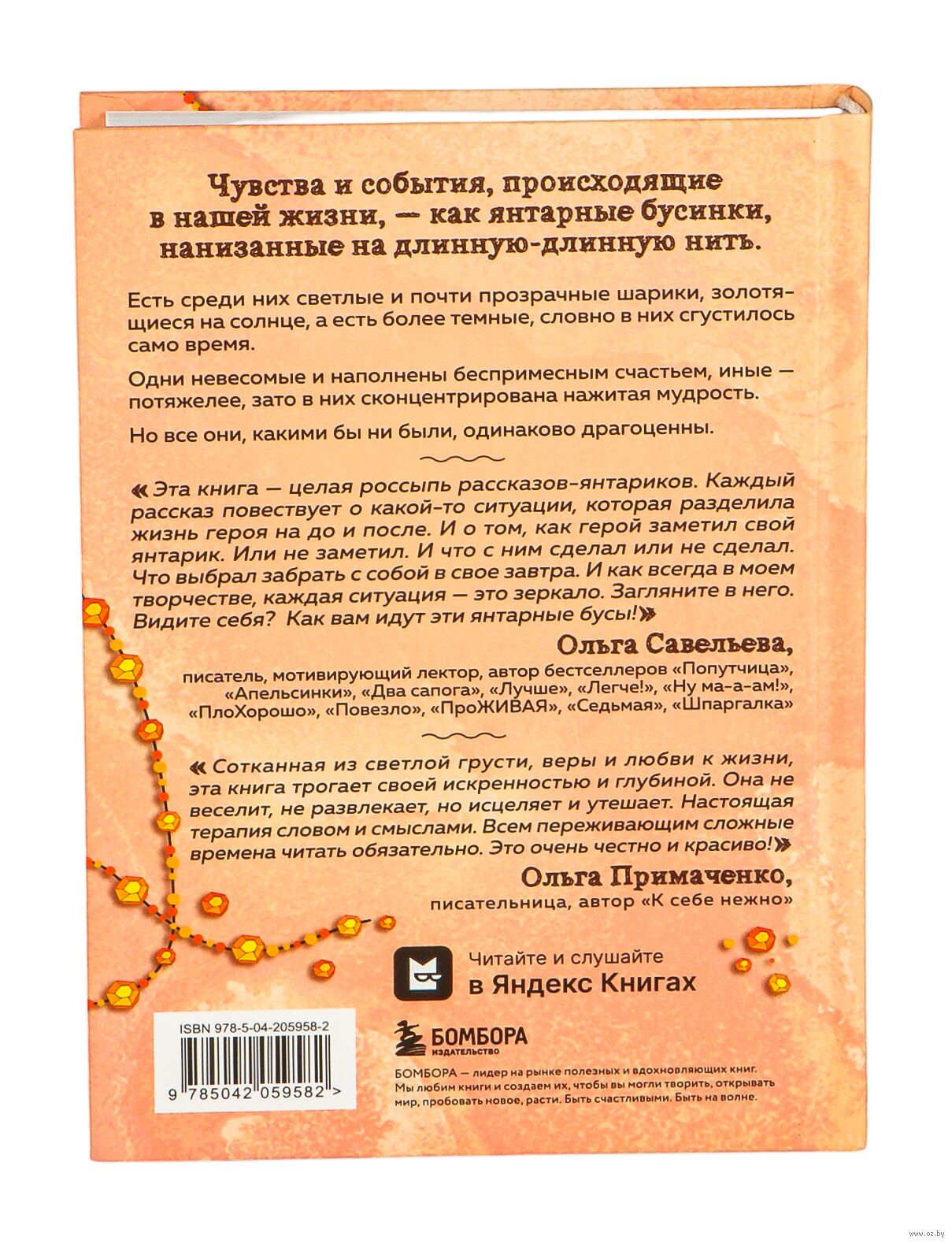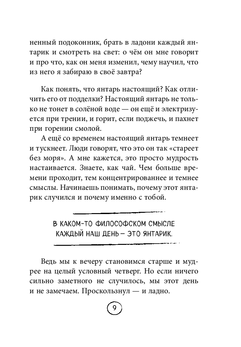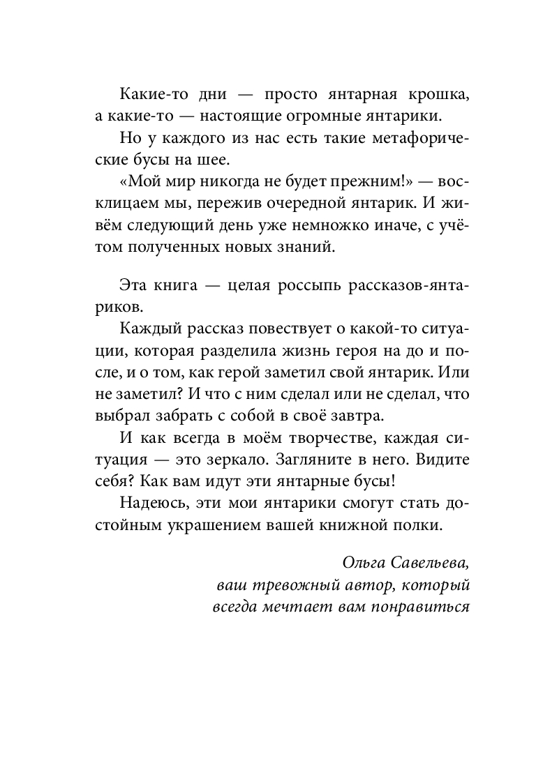 Каждый рассказ повествует о какой-то ситуации, которая разделила жизнь героя на до и после. И о том, как герой заметил свой янтарик. Или не заметил. И что с ним сделал или не сделал. Что выбрал забрать с собой в своё завтра.