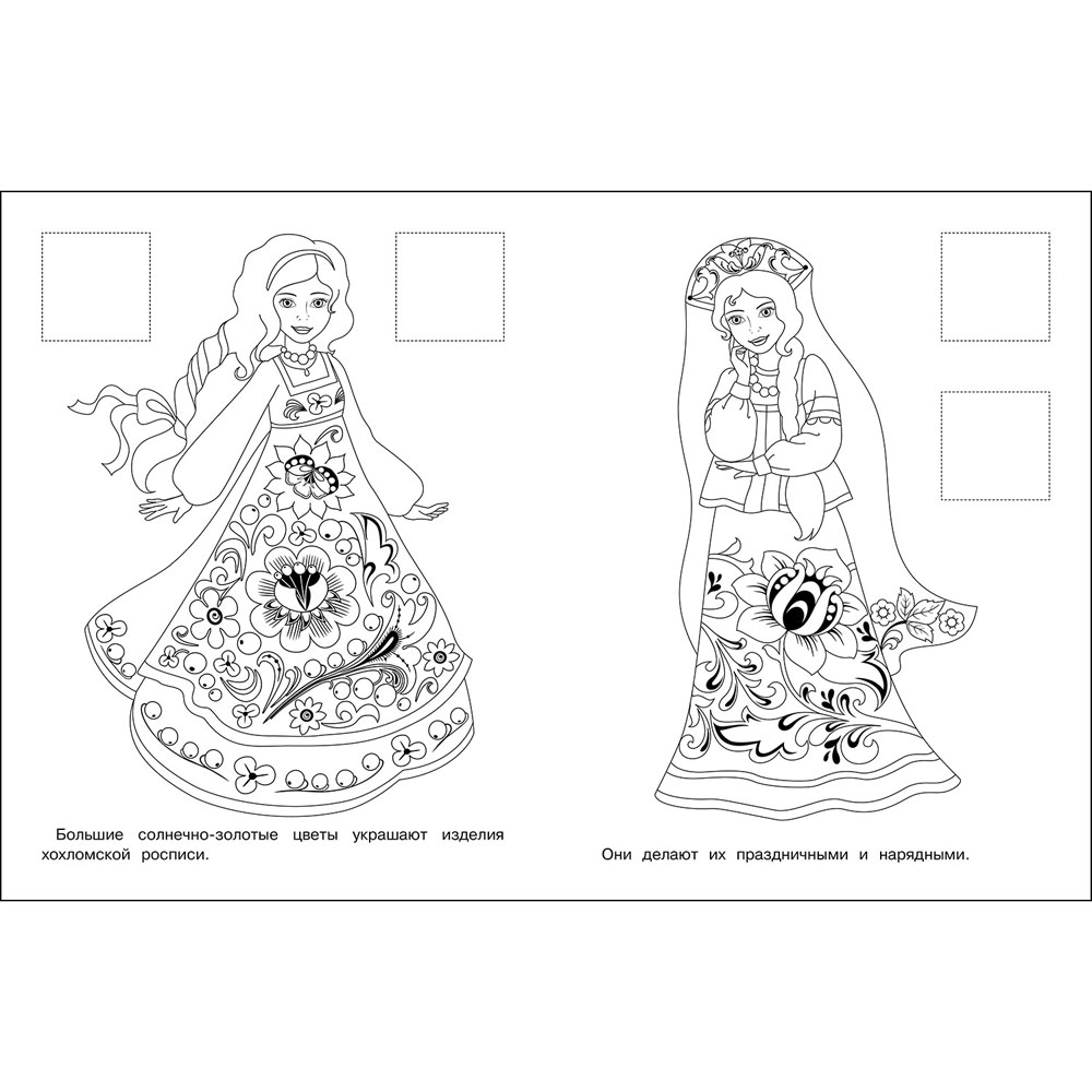 На страницах этой книжки русские красавицы познакомят ребенка с великолепной хохломской росписью. Он сможет раскрасить узоры на платьях и узнать об истории росписи, ее основных элементами и традиционной цветовой гамме.