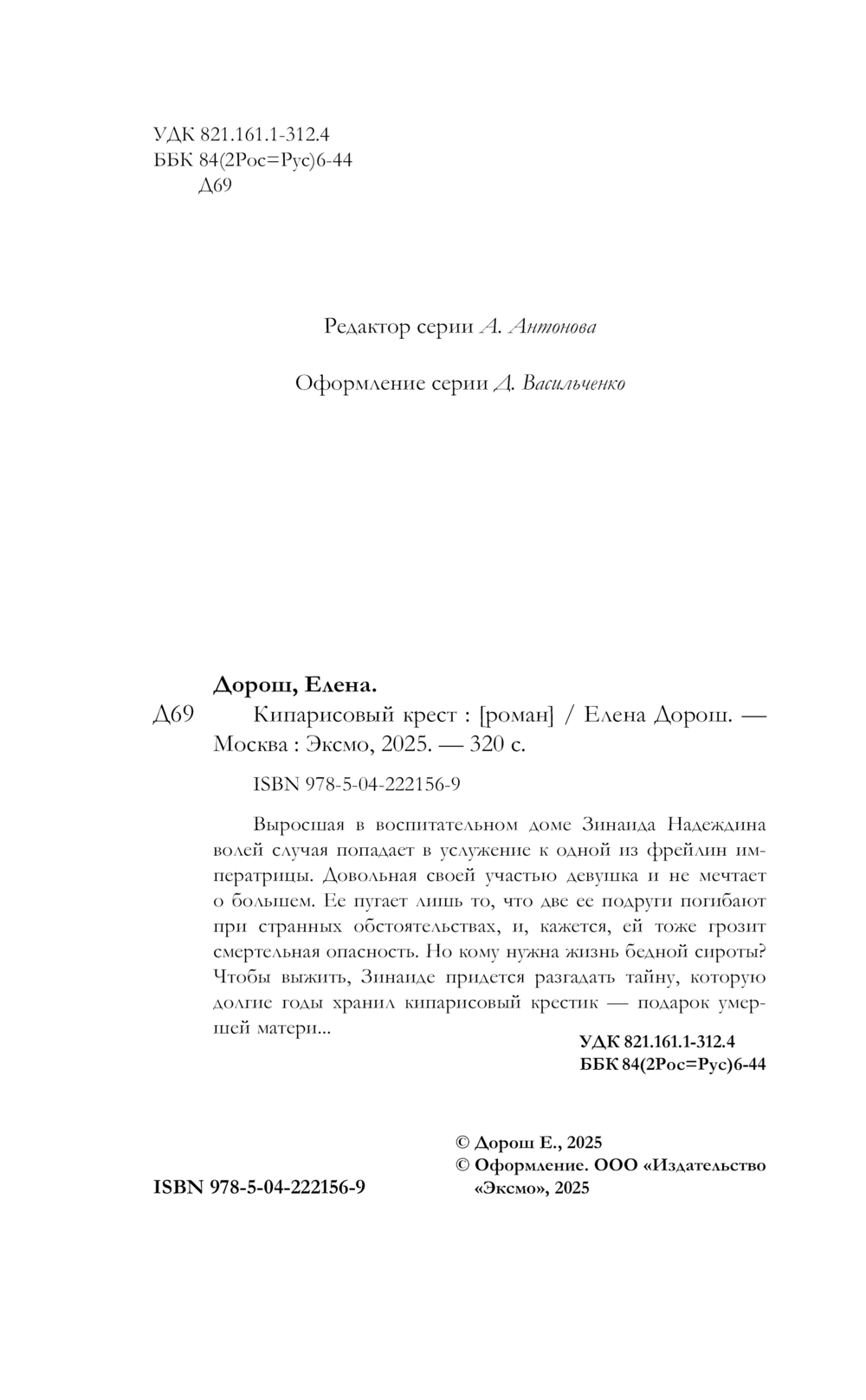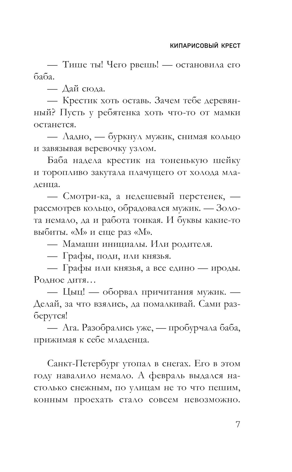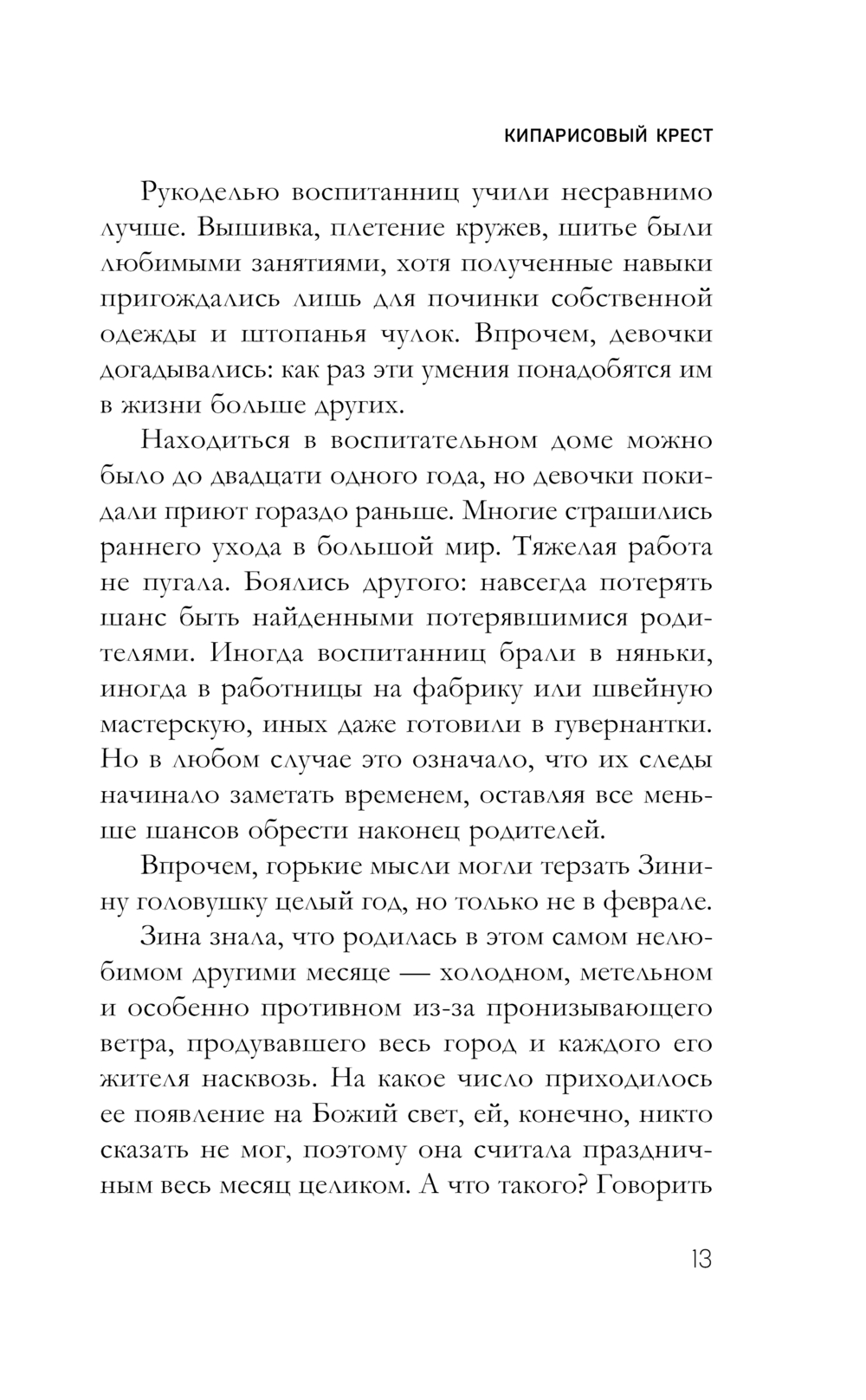 Выросшая в воспитательном доме Зинаида Надеждина волей случая попадает в услужение к одной из фрейлин императрицы. Довольная своей участью девушка и не мечтает о большем. Ее пугает лишь то, что две ее подруги погибают при странных обстоятельствах, и, кажется, ей тоже грозит смертельная опасность. Но кому нужна жизнь бедной сироты? Чтобы выжить, Зинаиде придется разгадать тайну, которую долгие годы хранил кипарисовый крестик – подарок умершей матери…
