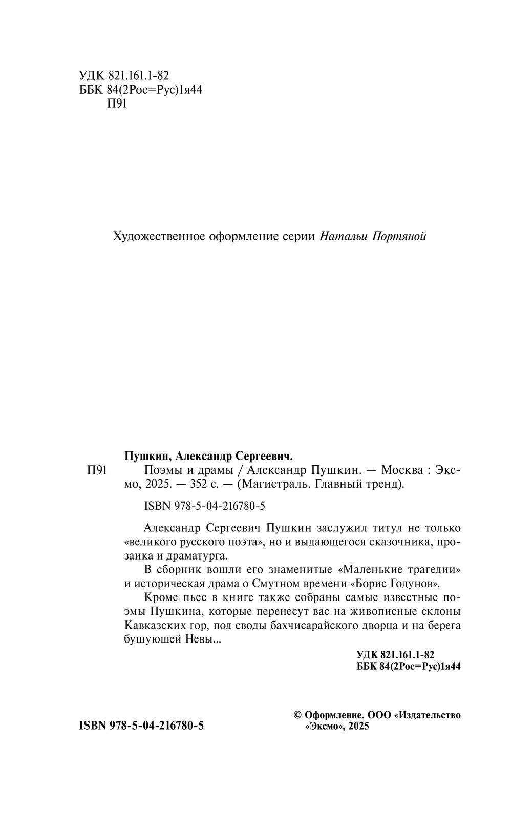 Александр Сергеевич Пушкин заслужил титул не только "великого русского поэта", но и выдающегося сказочника, прозаика и драматурга. В сборник вошли его знаменитые "Маленькие трагедии" и историческая драма о Смутном времени "Борис Годунов". Кроме пьес в книге также собраны самые известные поэмы Пушкина, которые перенесут вас на живописные склоны Кавказских гор, под своды бахчисарайского дворца и на берега бушующей Невы...