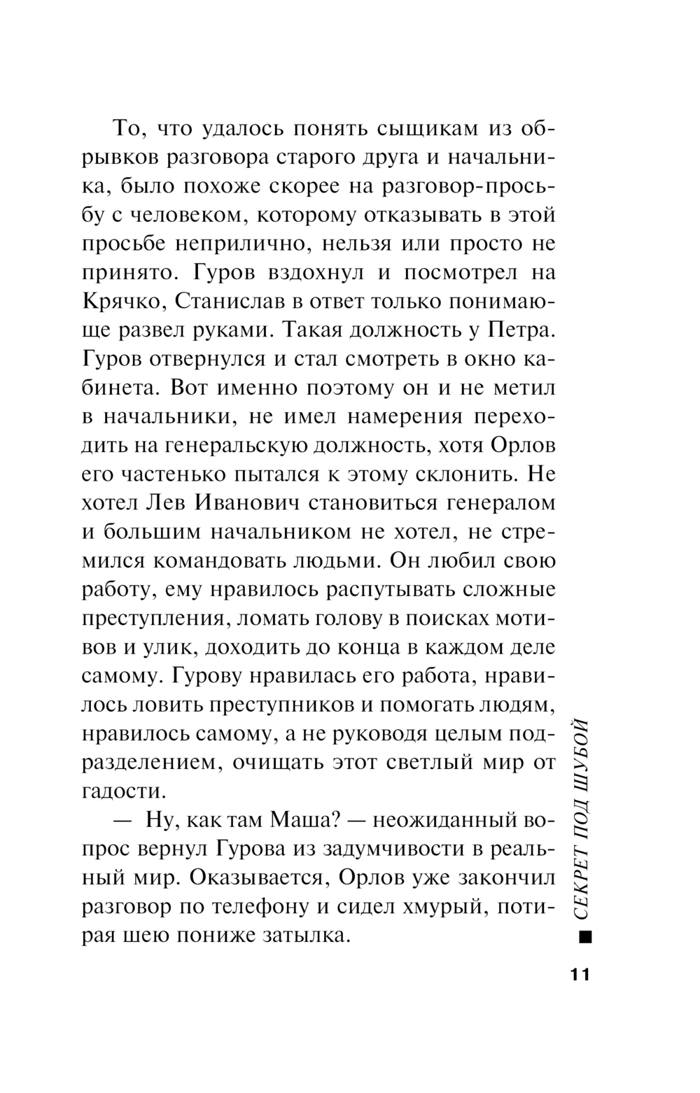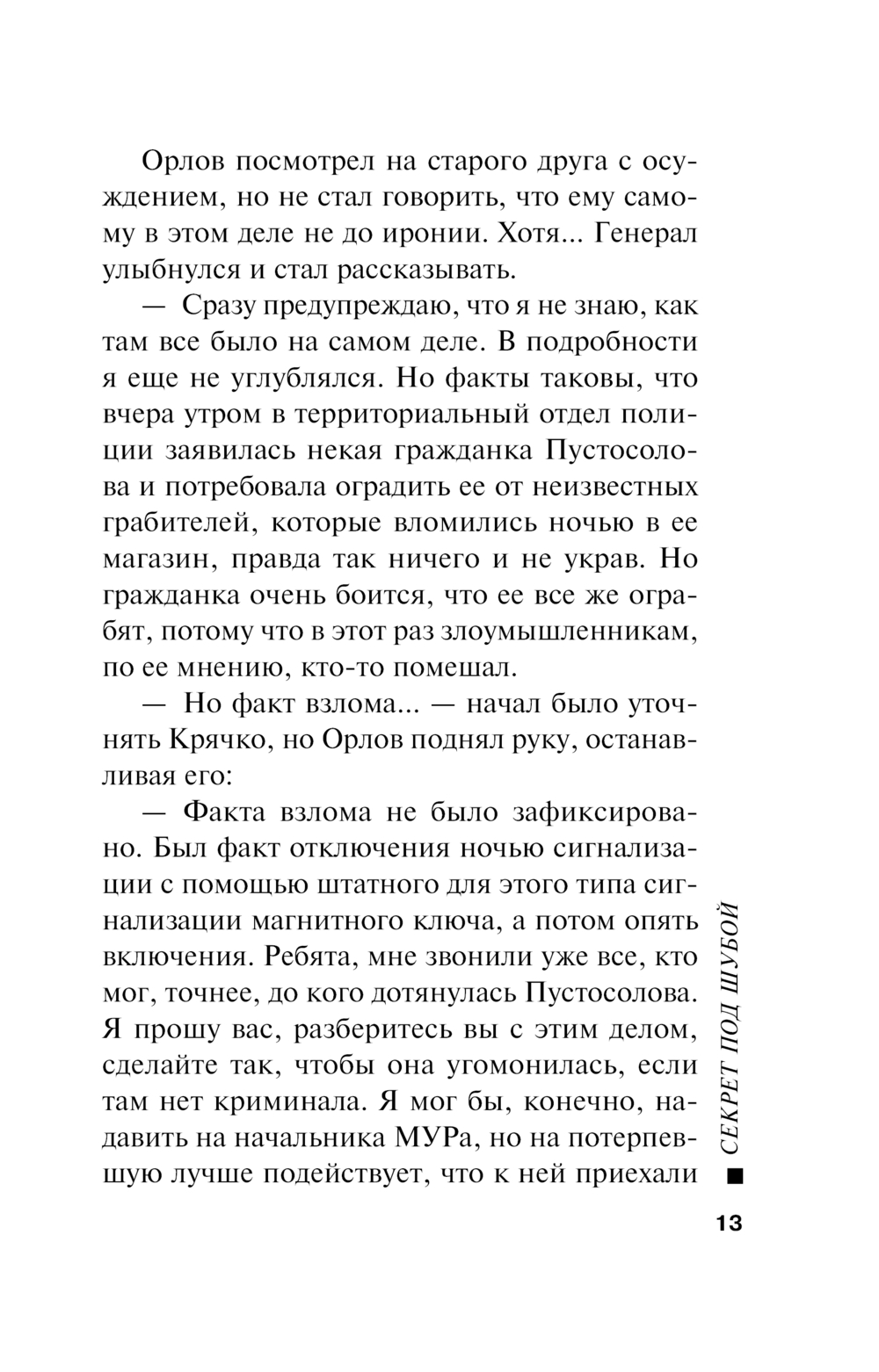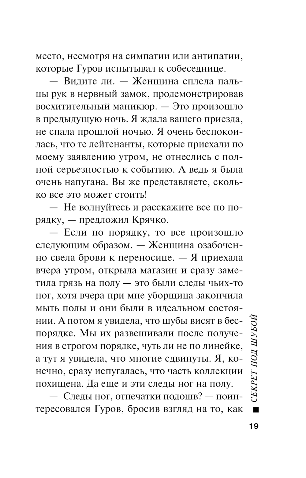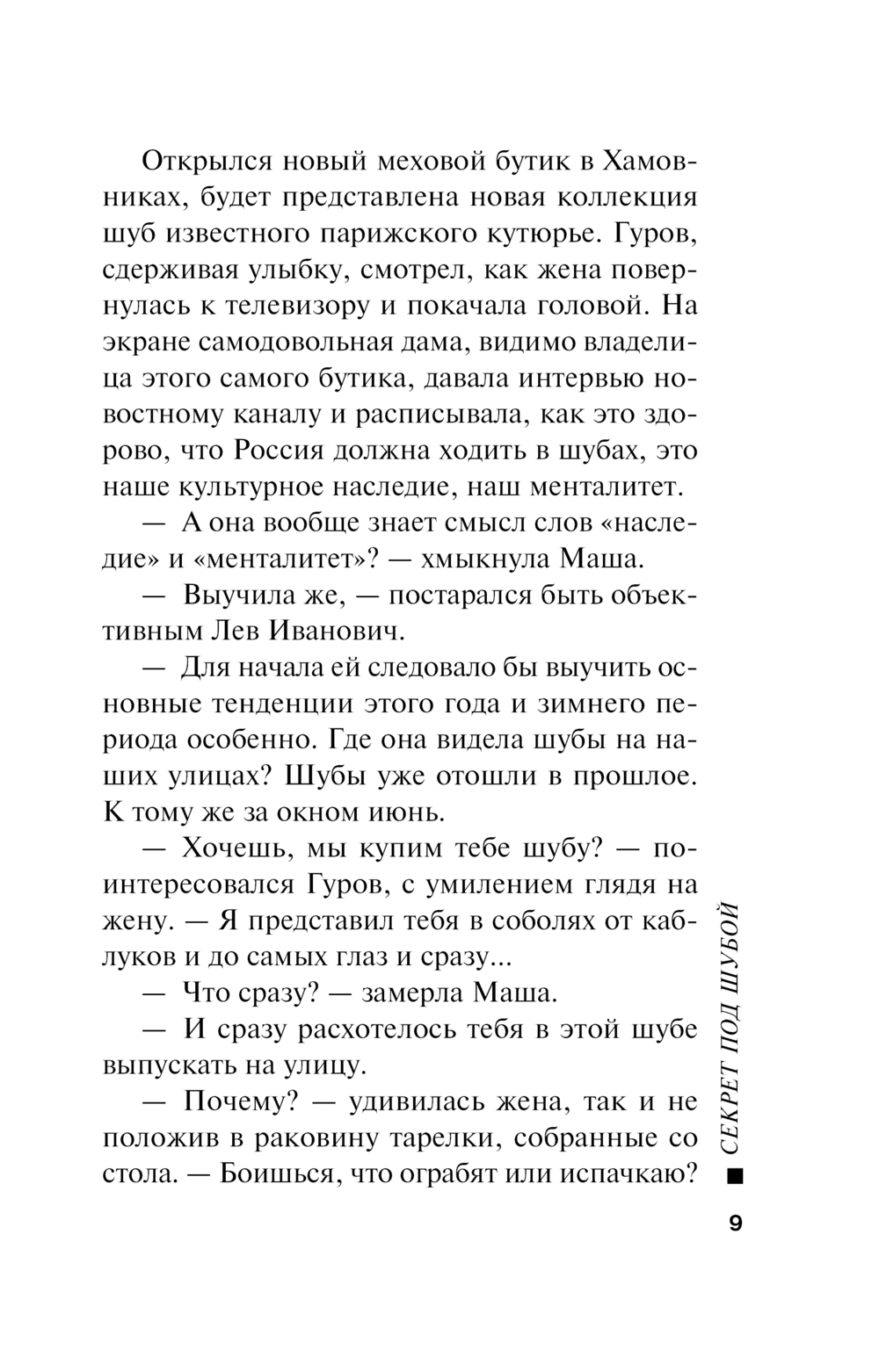 В одном из элитных меховых бутиков совершена попытка ограбления. Преступник ничего не взял, возможно, потому что уникальные меховые изделия коллекции очень трудно продать. Тогда зачем вообще нужно было проникать в хорошо охраняемое помещение… Полковник МВД Лев Гуров выясняет, что в ту ночь сигнализацию бутика не взламывали, а аккуратно отключили. Подозрение падает на людей, близких к хозяйке магазина. Сыщик уверен: еще немного, и тайна странного преступления будет раскрыта. Лев Иванович даже не догадывается, что он только в самом начале невероятно запутанного уголовного сюжета…