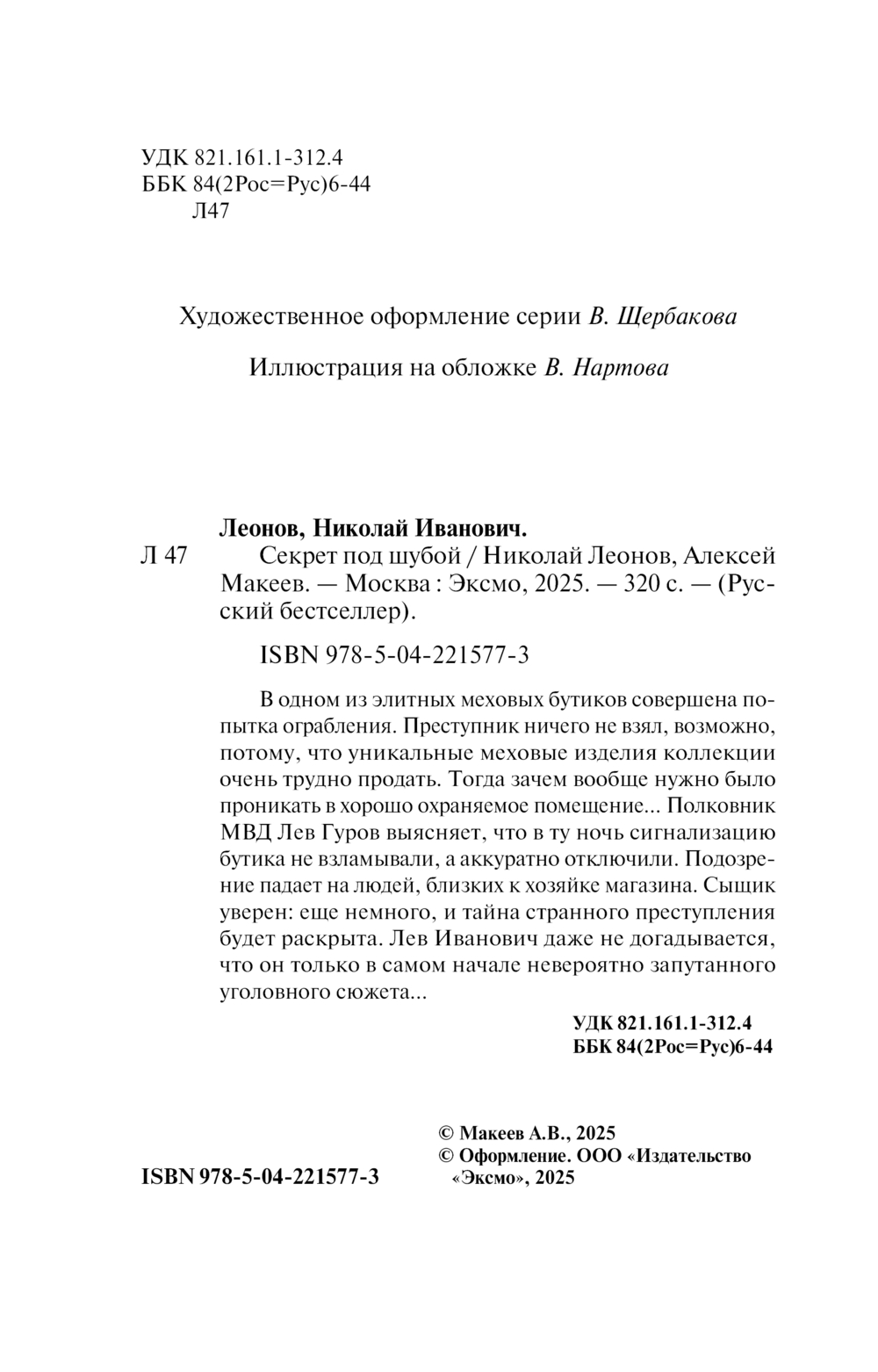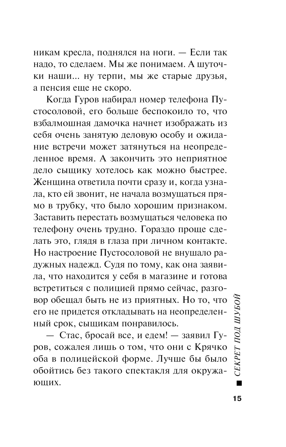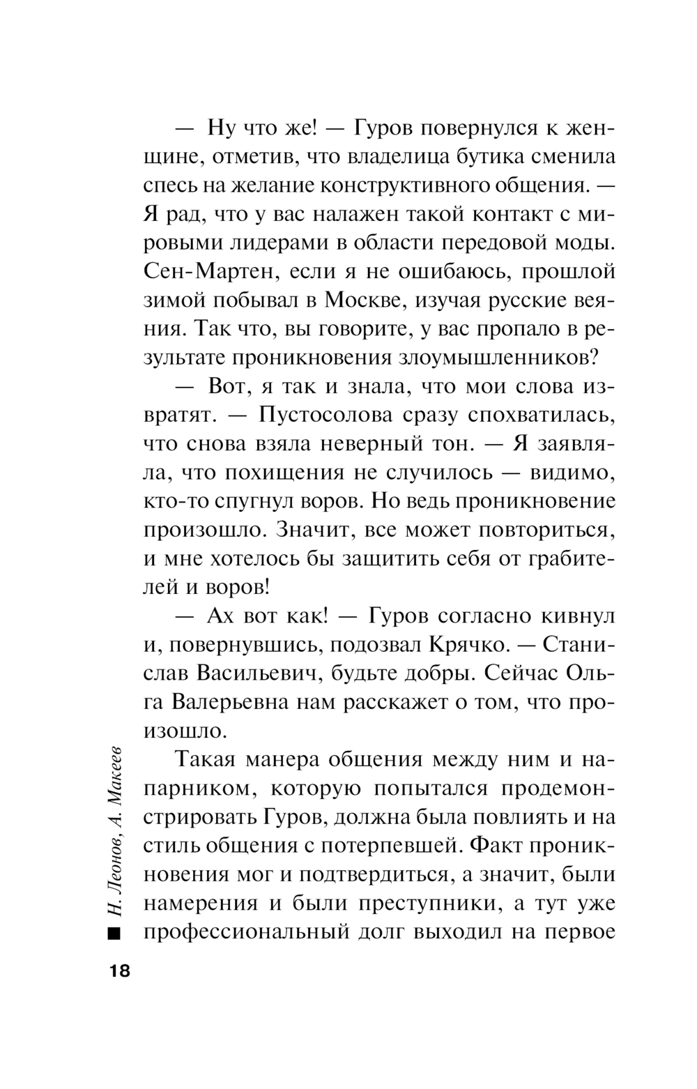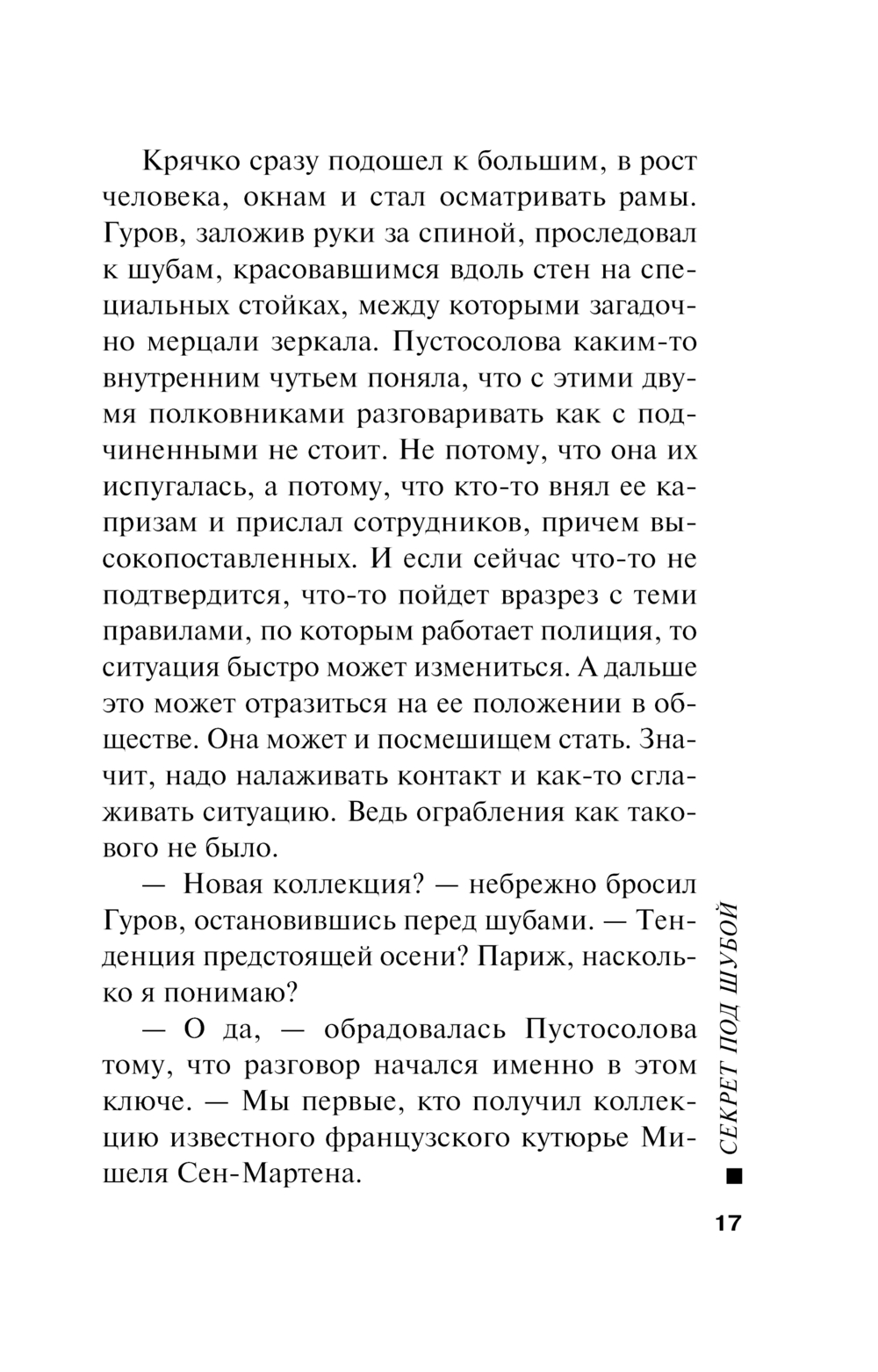 В одном из элитных меховых бутиков совершена попытка ограбления. Преступник ничего не взял, возможно, потому что уникальные меховые изделия коллекции очень трудно продать. Тогда зачем вообще нужно было проникать в хорошо охраняемое помещение… Полковник МВД Лев Гуров выясняет, что в ту ночь сигнализацию бутика не взламывали, а аккуратно отключили. Подозрение падает на людей, близких к хозяйке магазина. Сыщик уверен: еще немного, и тайна странного преступления будет раскрыта. Лев Иванович даже не догадывается, что он только в самом начале невероятно запутанного уголовного сюжета…